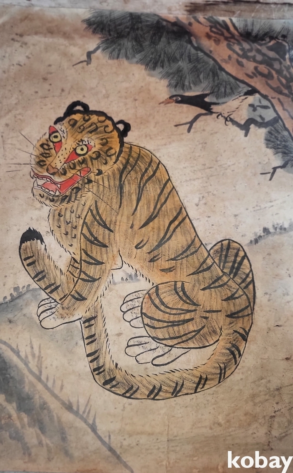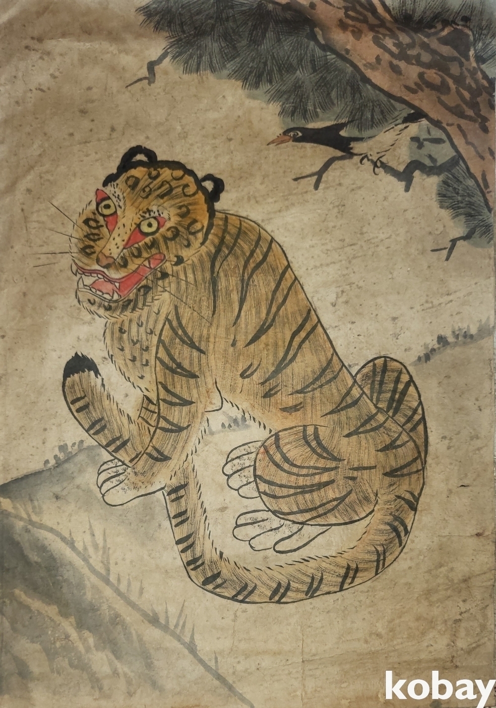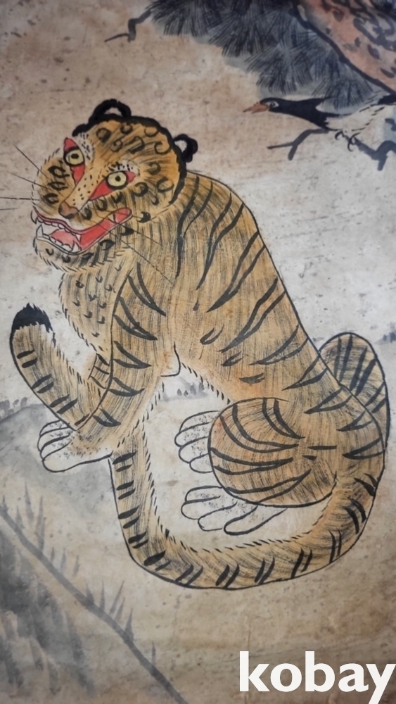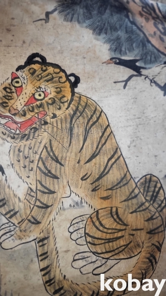소나무에 앉이있는 까치의 모습과 웃고있는 해학적인 호랑이의 조화가 매우 아름다운 민화로 명품입니다,