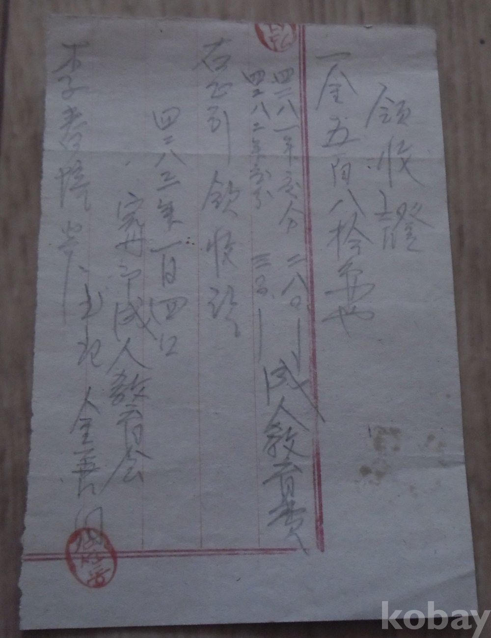 1950년 완주군 성인교육회 발행 필사 영수증