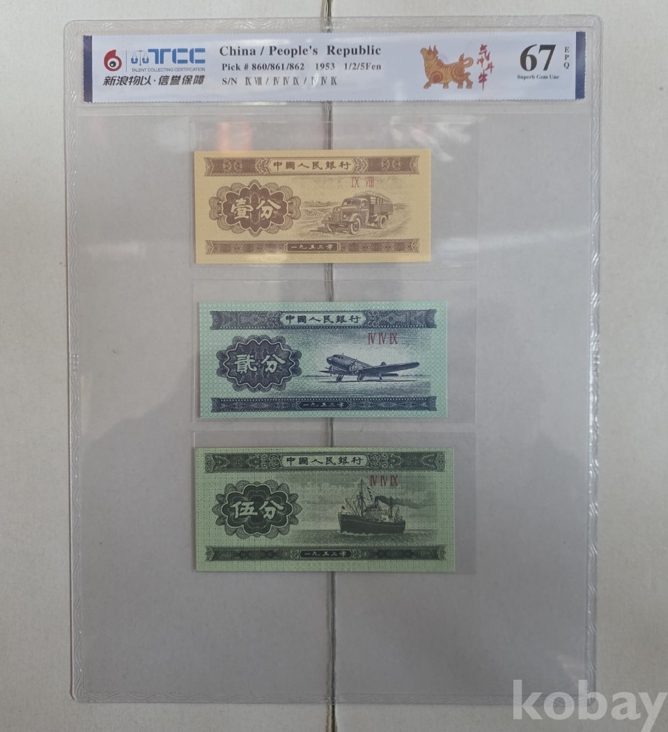 -1953년 중국 소액보조 분권 5, 2, 1분 3종 지폐 TCC67 고등급 입니다.