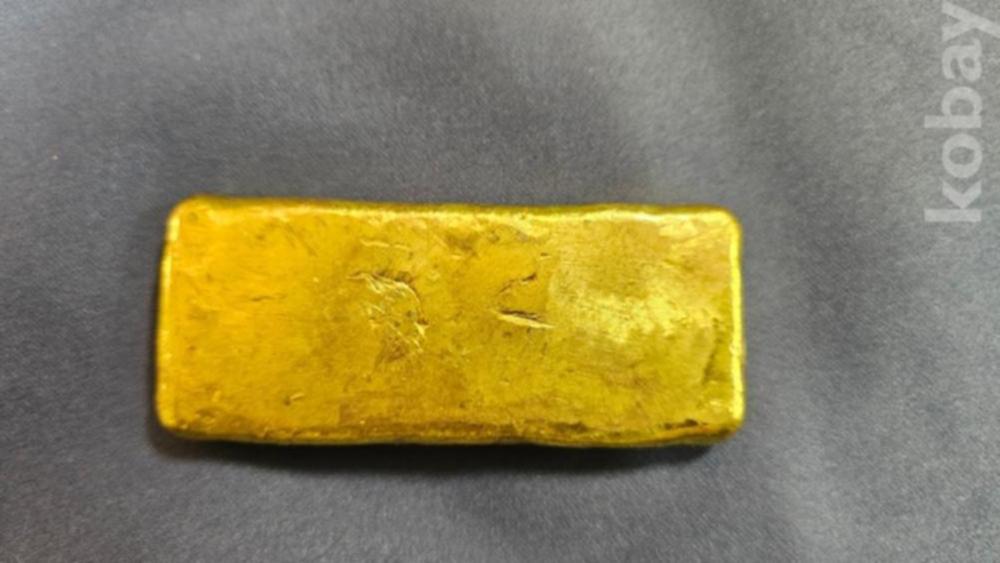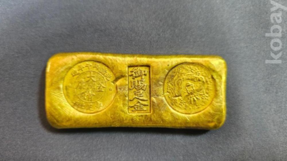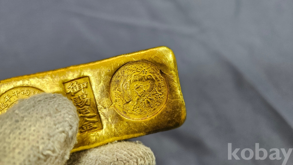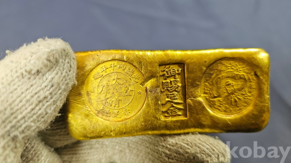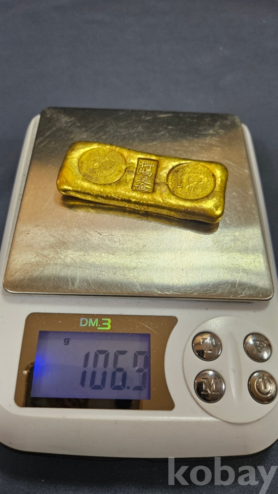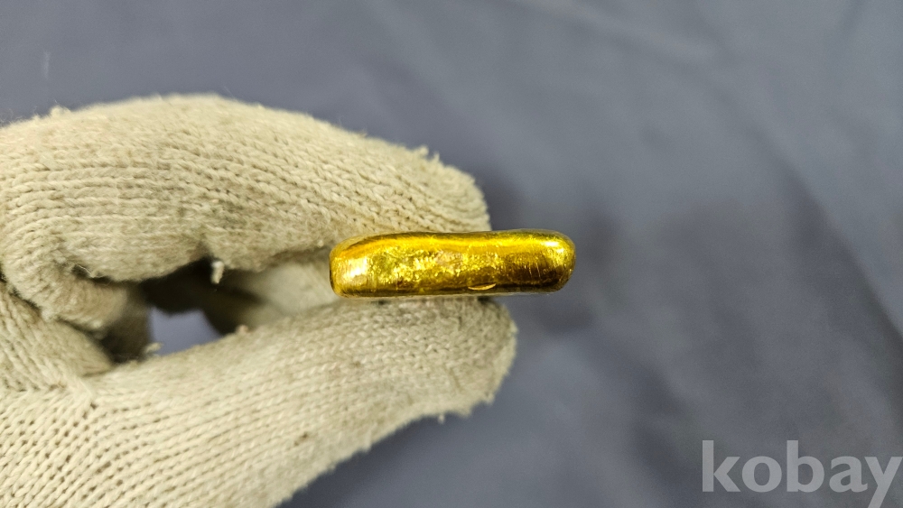 글자와 문양이 찍혀져있는 금괴형 골드바형 금색 덩어리 입니다.