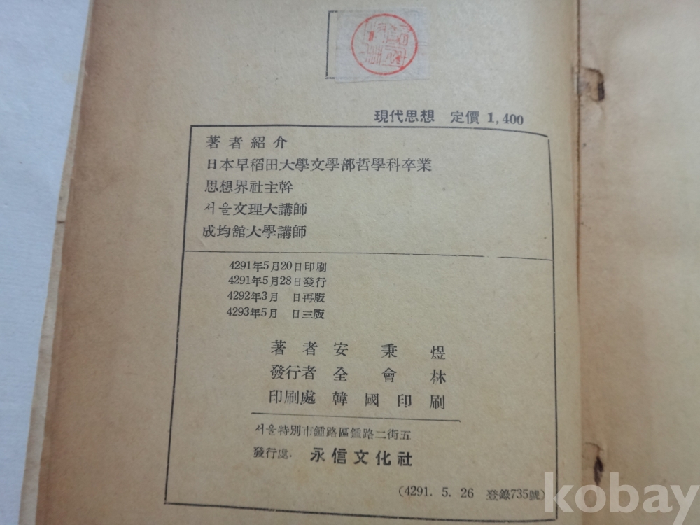 현대사상 (1960년, 안병욱 저, 영신문화사)