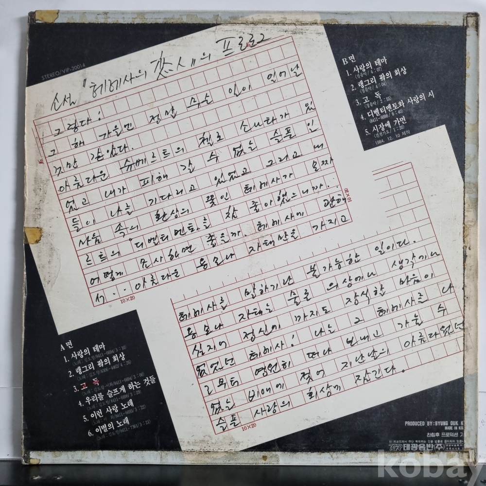 | 자켓상태 | G : 눈에 띄는 손상, 테이프, 필기 존재 | 음반상태 | VG : 생활 기스 다수, 가벼운 노이즈 존재 | 발매정보 | 초반 | 가사지여부 | 유 |