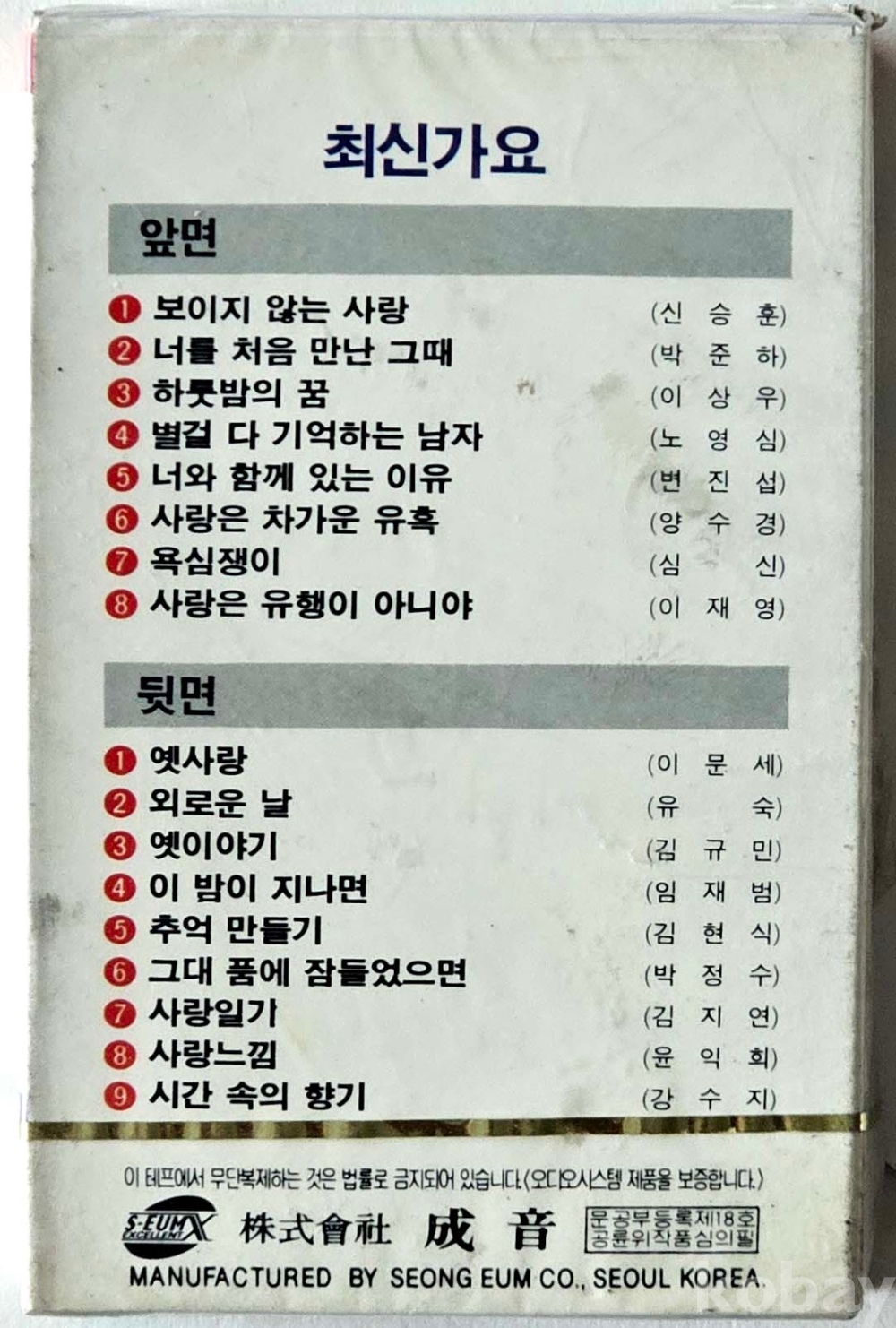 상 품 설 명 | 사진참고 / 경매에 올려야할 카세트테이프가 많아 앞면 한장만 올립니다. 자세한 상태와 필요하신 내용의 자료 사진이 더 보고싶으시거나 궁금하신 분들께서는 해당 경매건의 물품문의로 사진을 요구하시면 내용추가로 추가사진과 내용을 올리도록 하겠습니다. |