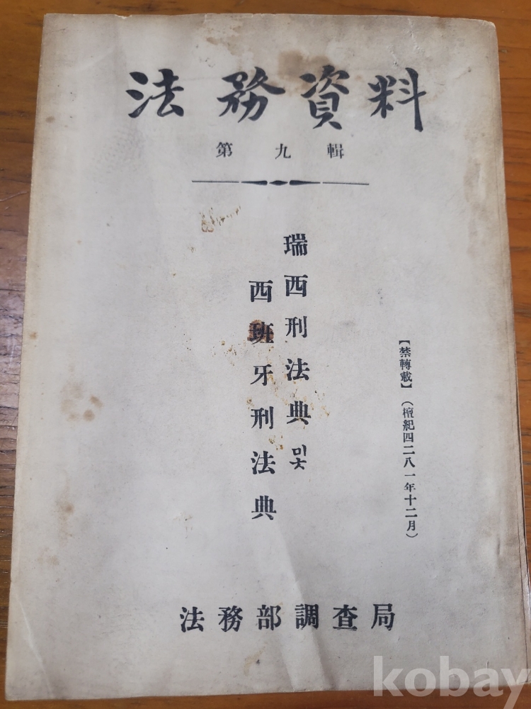1. 법무자료 제9집 - 서서형법전 및 서반아형법전, 법무부조사국, 1948년, 389쪽, 상태 상, 사진 참조