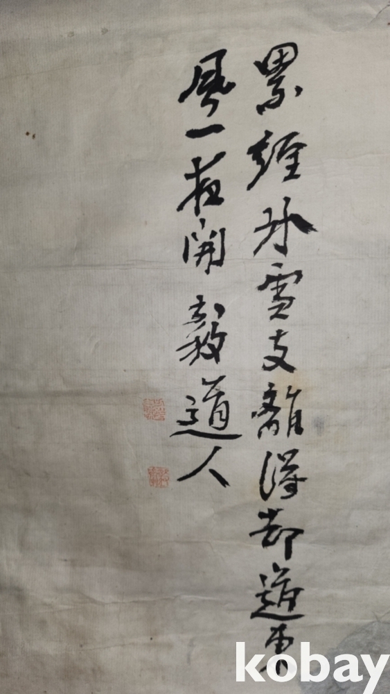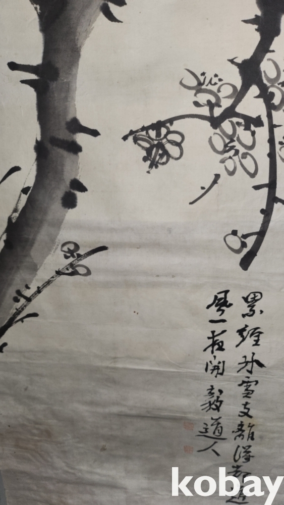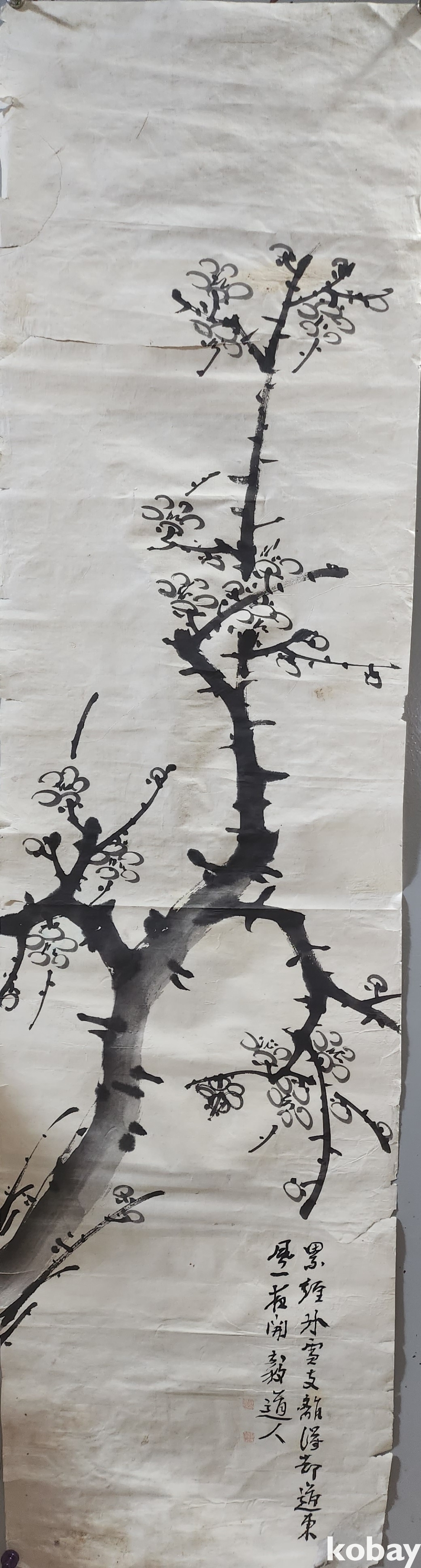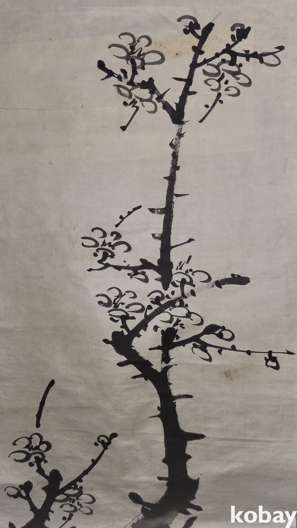 한국화가 의제 허백련 수결이 보이는 종이에 채색된 매화 그림입니다,