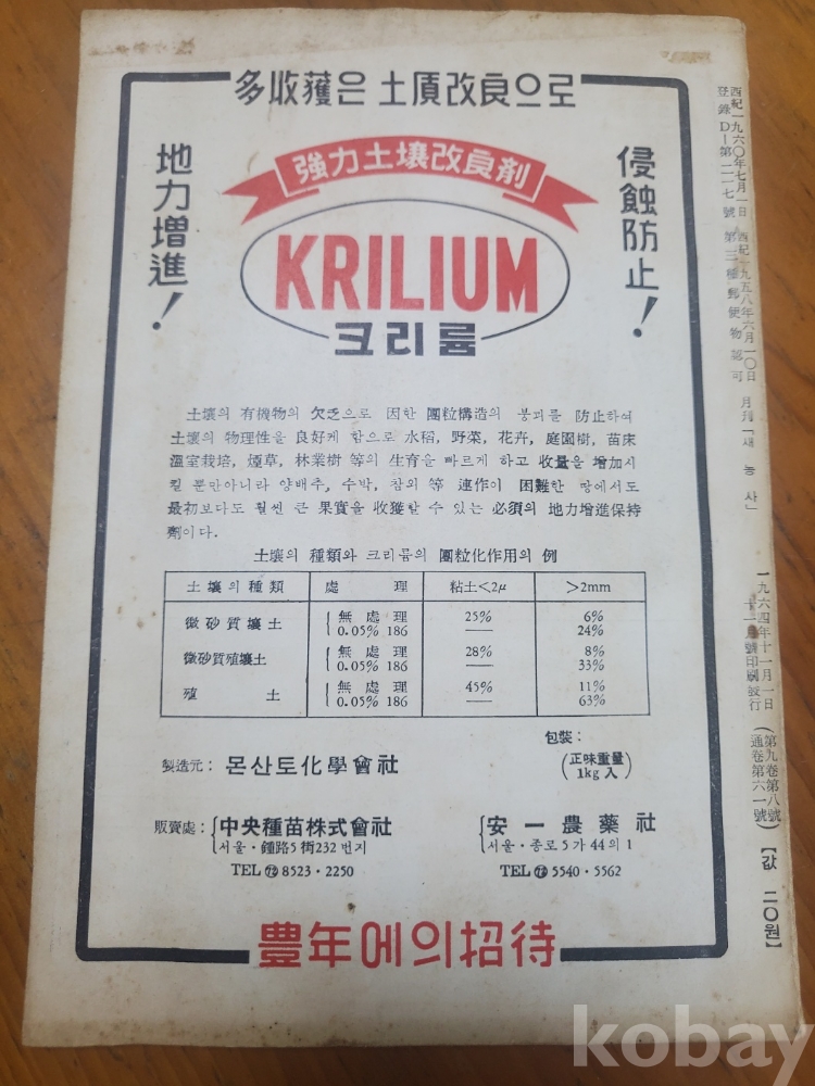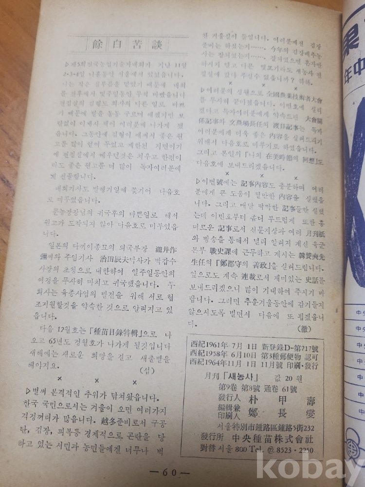 1. 새농사 통권 61호, 중앙종묘주식회사, 1964년, 60쪽, 월간, 상태 상, 사진 참조