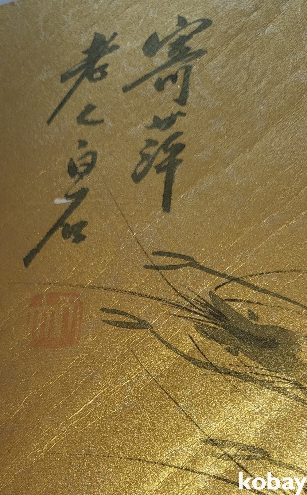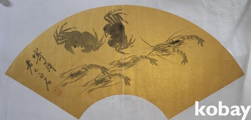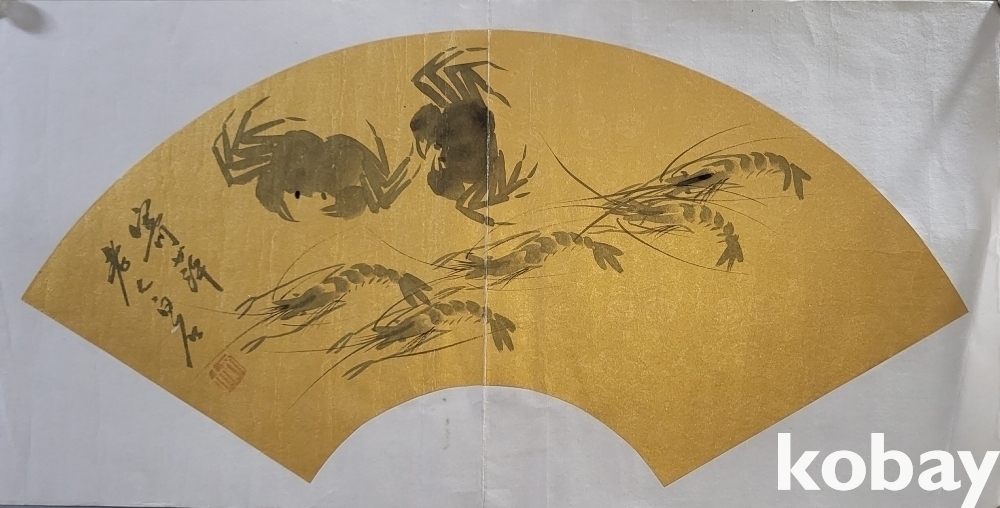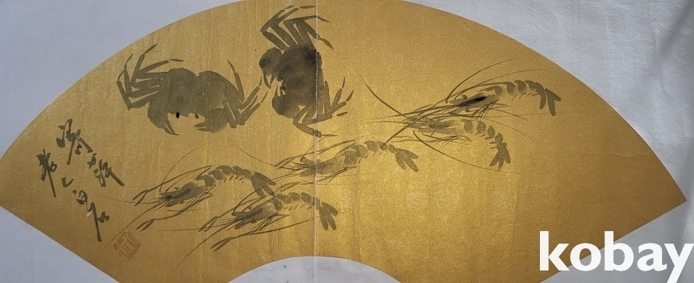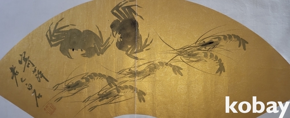 중국 유명화가 제백석 수결이 보이는 새우와 게 선면도 그림입니다,