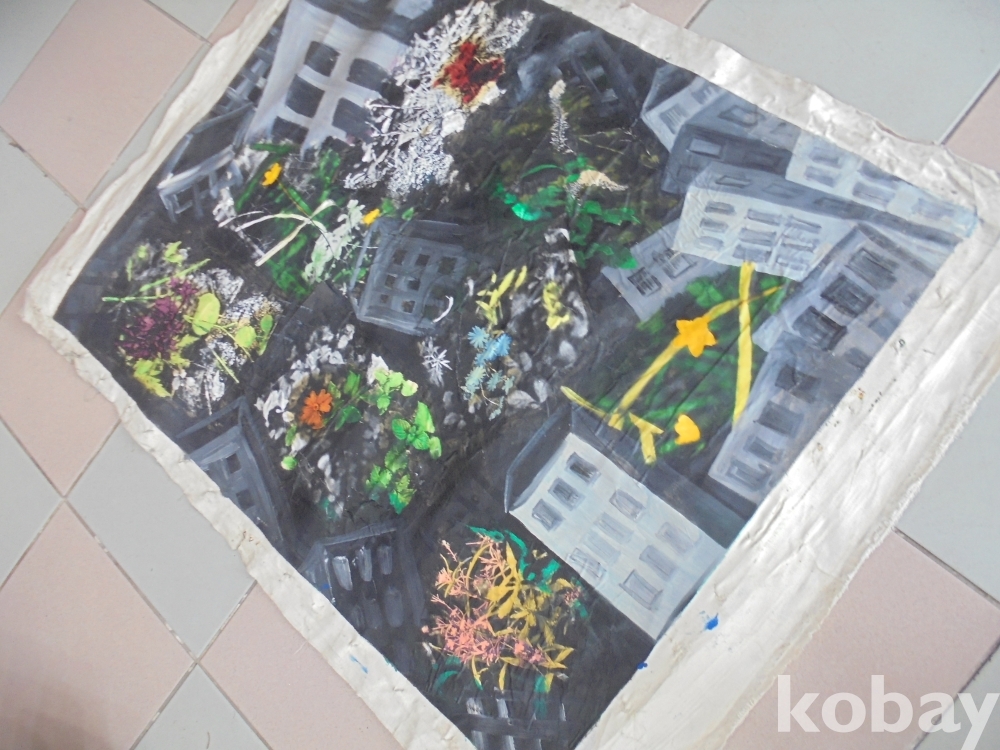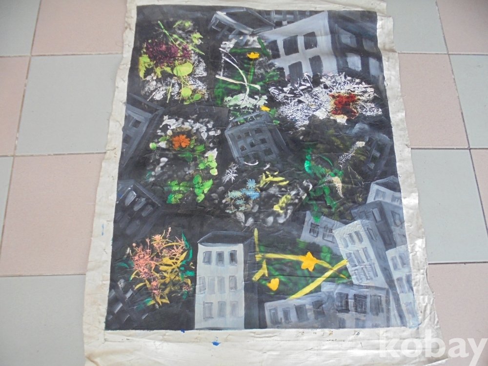도시건물에 지진이났는지 아파트건물이 기울려져있고 사이에 군방화꽃이 그려져있는 특이한 건물과 꽃그림유화