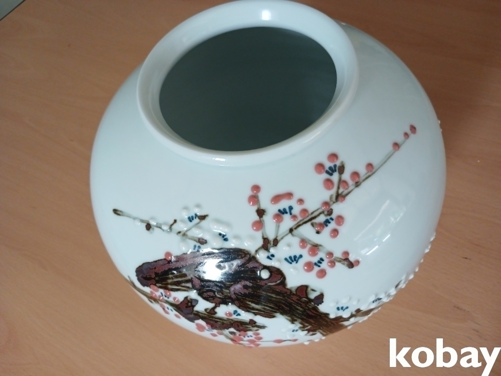 매화 꽃을 입체감 있게 표현한 달 도자기 입니다.
