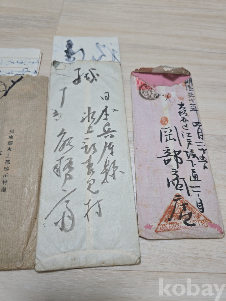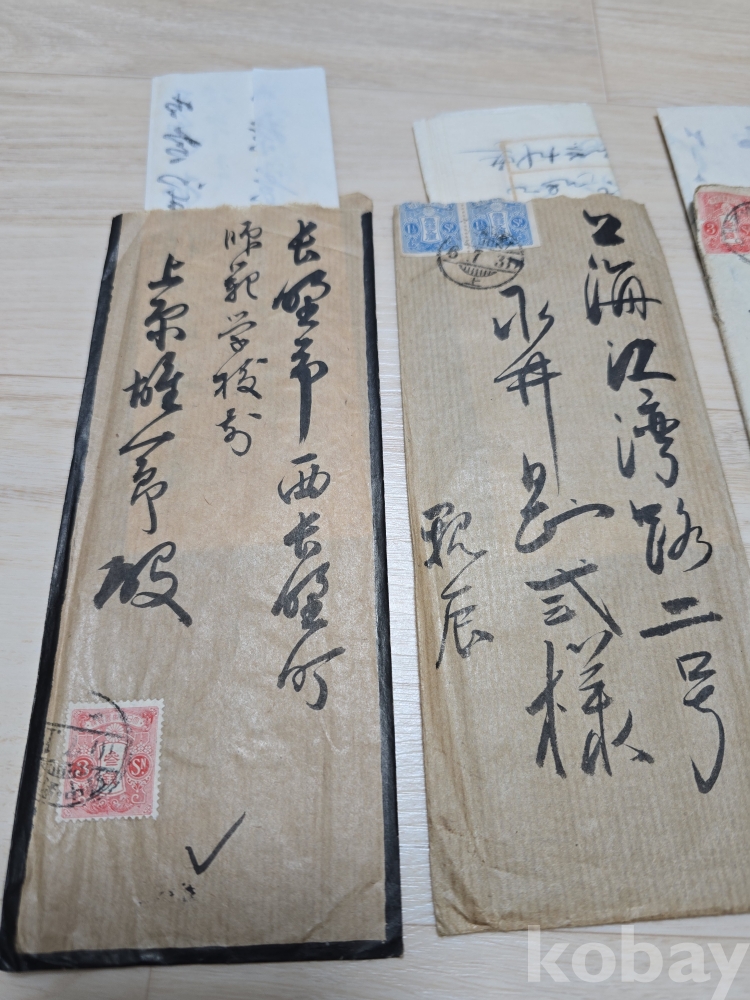 [설명] 누군가의 사연이 담겨 있을 오래된 편지 봉투 4점입니다. 내용물은 확인되지 않으나, 봉투 겉면에 적힌 주소를 통해 격동의 시기였던 20세기 초반, 중국 상해와 일본을 오갔던 서신임을 알 수 있습니다. 특히 우측의 봉투에는 **'친전(親展 - 본인이 직접 뜯어볼 것)'**이라는 문구가 적혀 있어 어떤 비밀스러운 내용이 담겨 있었을지 호기심을 자극합니다. 누렇게 바랜 종이 색감과 멋스러운 붓글씨, 그리고 엔틱한 우표가 어우러져 액자에 넣어 디스플레이 하거나 근대 우편 자료로 수집하기에 아주 좋은 아이템입니다.