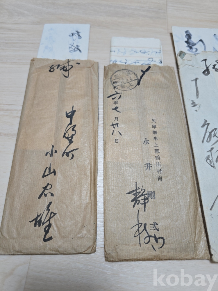 특징: 당시의 우표가 소인 찍힌 채로 붙어 있으며, 수신인 이름 등이 유려한 붓글씨(행서/초서)로 적혀 있습니다.