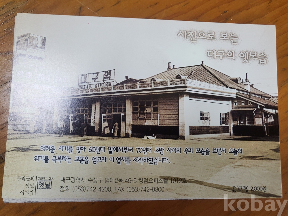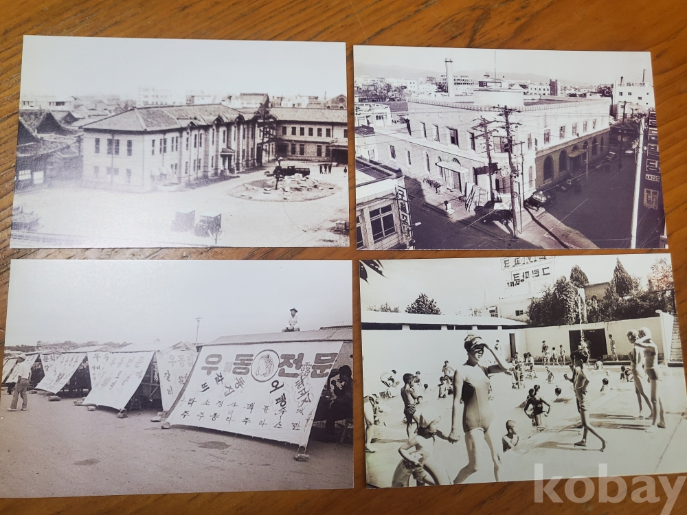 2. 엽서의 구체적 목록(사진) : 옛 대구역 / 미니가이(三中正)백화점(대구 최초의 백화점. 현 북성로 입구) / 군인극장(대구시 중구 동문동 동문상가 앞에 있던) / 옛 대구경찰서(현 대구 중부 경찰서 자리) / 경상북도 상공 진흥관(옛 대구역 광장 라이프 상가가 들어서기 전에 있던) / 동촌 그린파크 수영장(대구 최초의 야외 수영장) / 경북도청(옛 경상감영 자리에 있던) / 옛 서문시장 1지구 주단포목부 상가 / 포장마차 행렬(요즘처럼 비닐포장이 아닌 광목천으로 만든 포장) / 상동교 자리에 있던 돌다리(비온 뒤 물이 불어나면 멀리 수성교로 돌아가야 했음) //