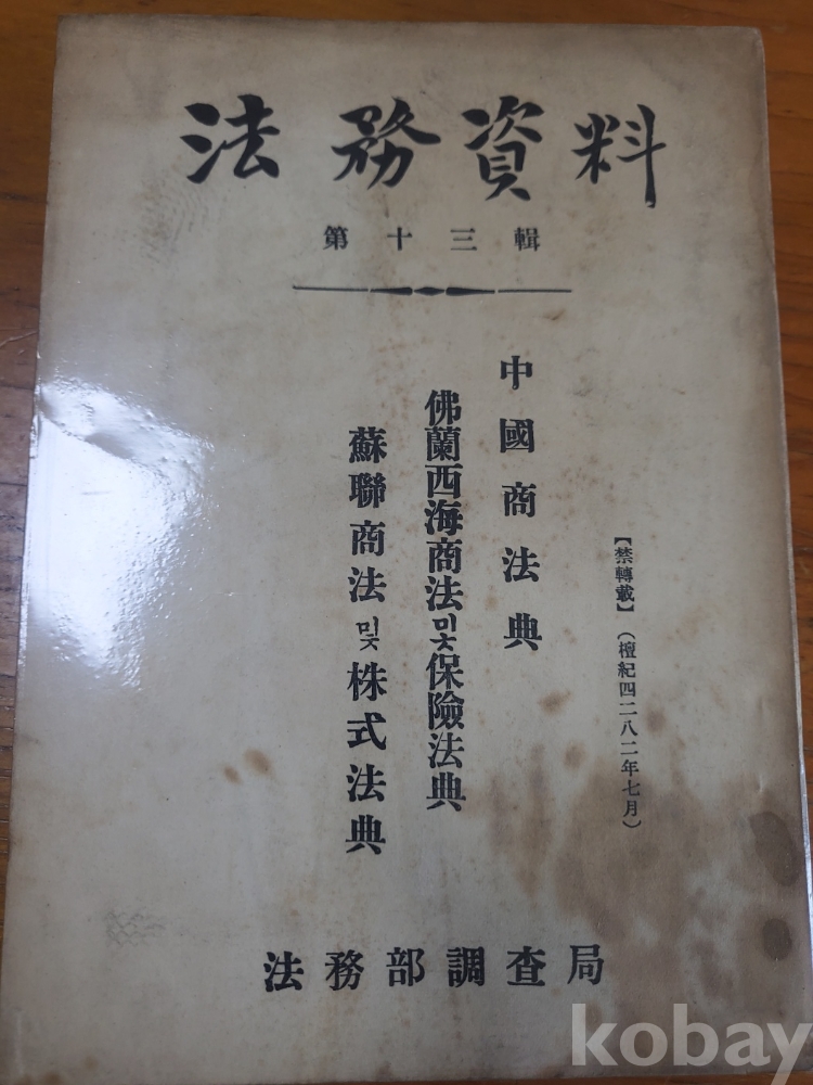 1. 법무자료 제13집 - 중국상법전 불란서해상법 및 보험법전 소련상법 및 주식법전, 법무부조사국, 1949년, 285쪽, 상태 상, 사진 참조