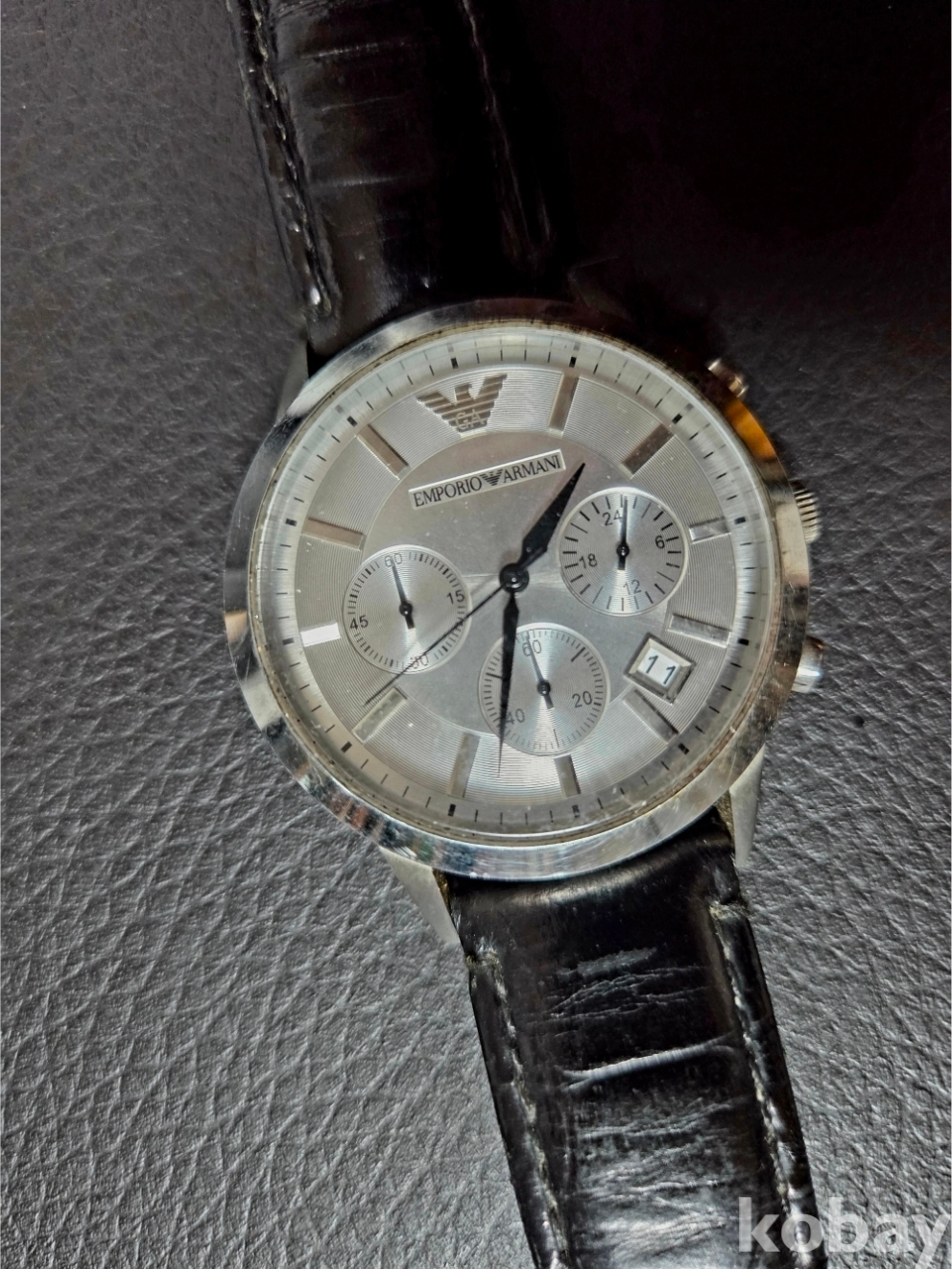 다이얼 하단에 **독수리 로고(Emporio Armani 상징)**가 명확히 보입니다.