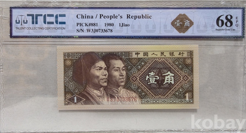 -1980년 중국 인민은행 발행 1각 지폐 TCC68 고등급 입니다.