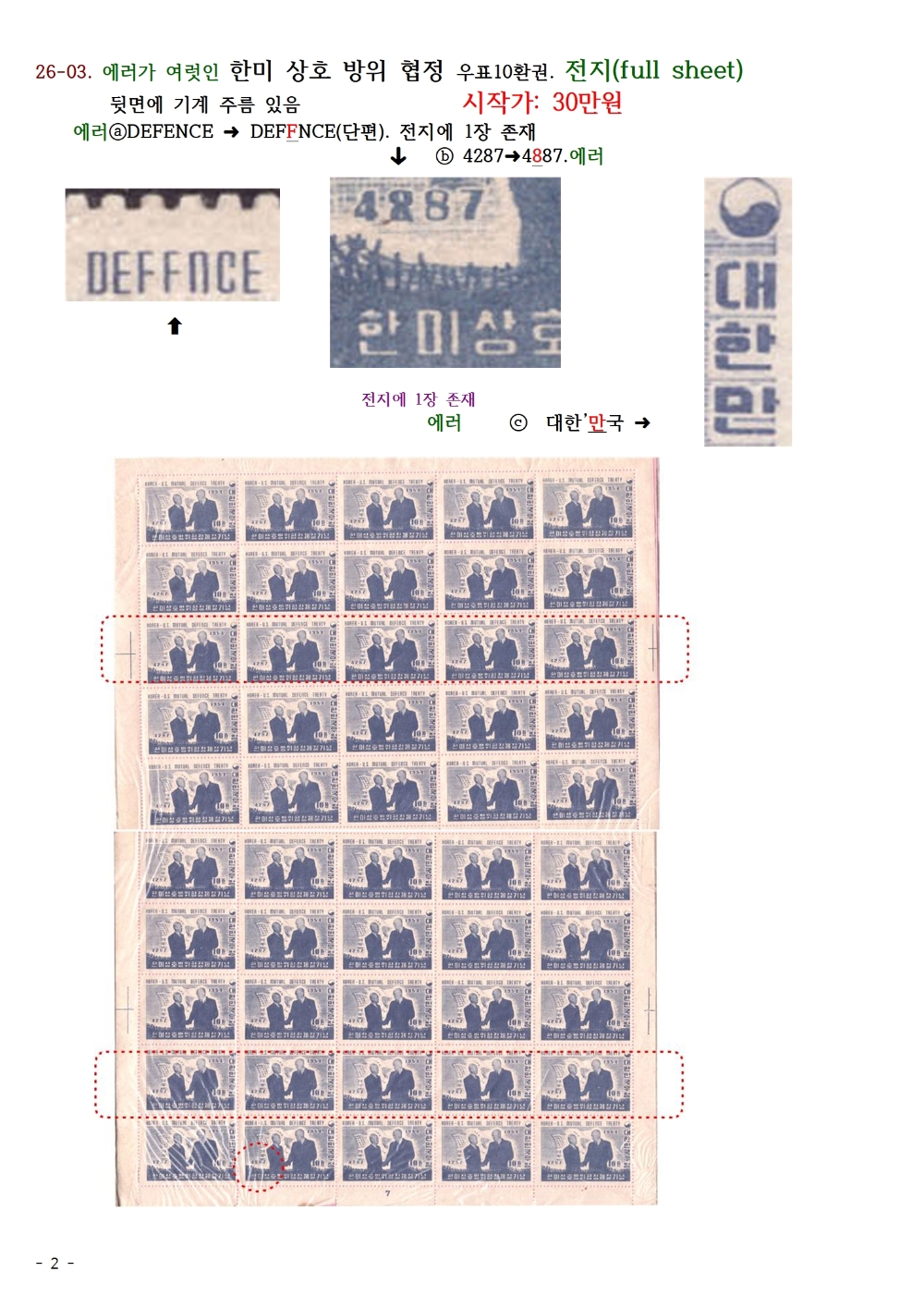 한미 상호 방위 협정 우표10환권. 전지(full sheet)