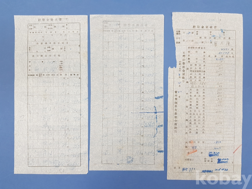 엽연초배상금일부전도지급조서,공제금영수증,배상금청구서,
