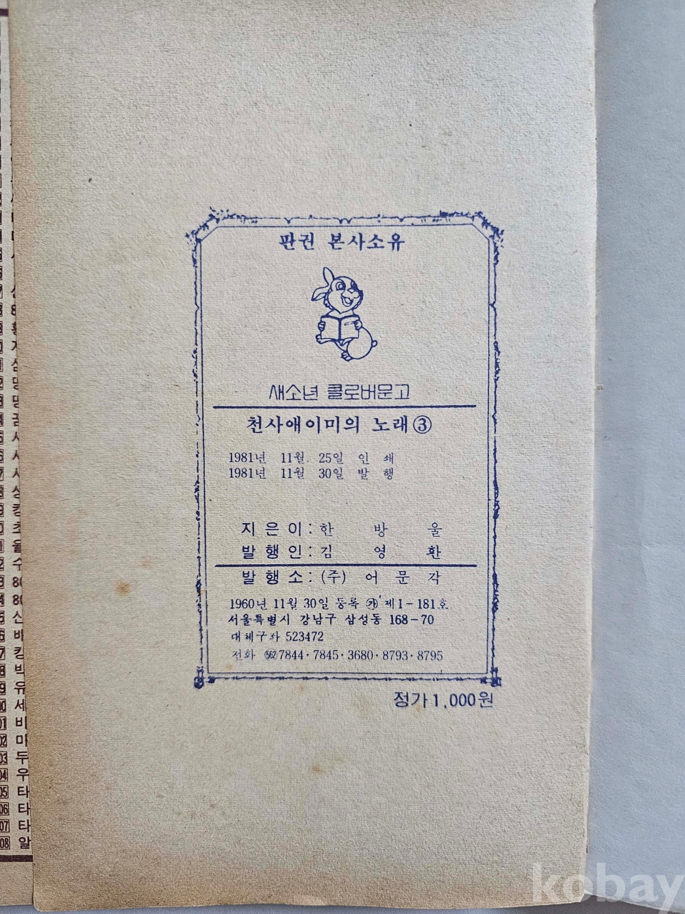 물 품 명 | 천사애이미의 노래 3편 / 한방울 만화 / 1981년 / 어문각 |