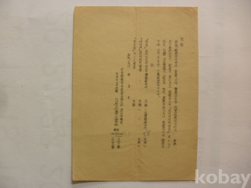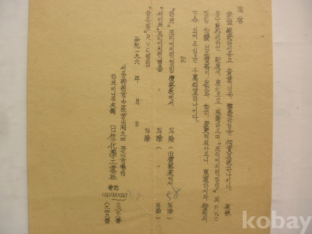 학표비니루본포 일신화학공업사 - 포리에치렌 필림 가격 변경 안내 (1960년대)
