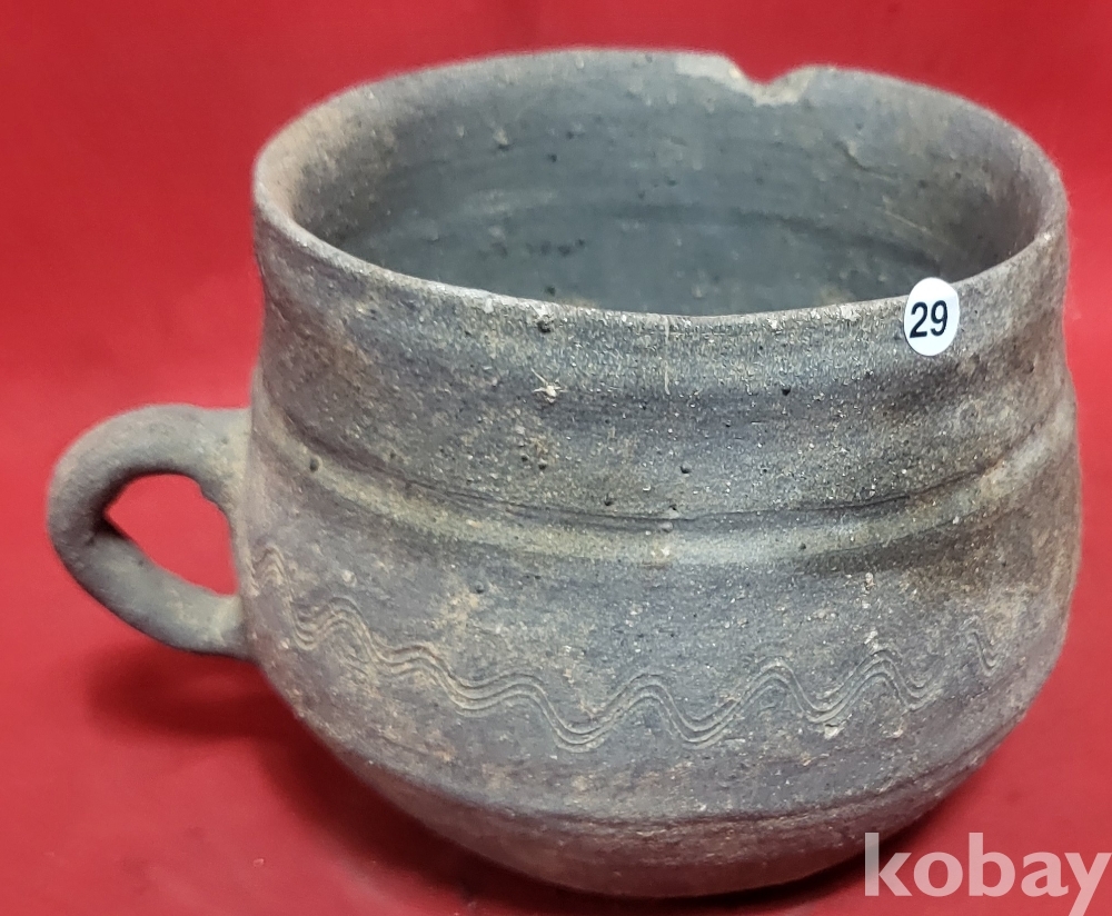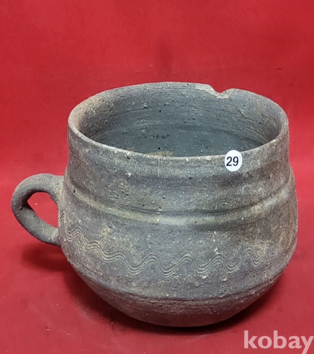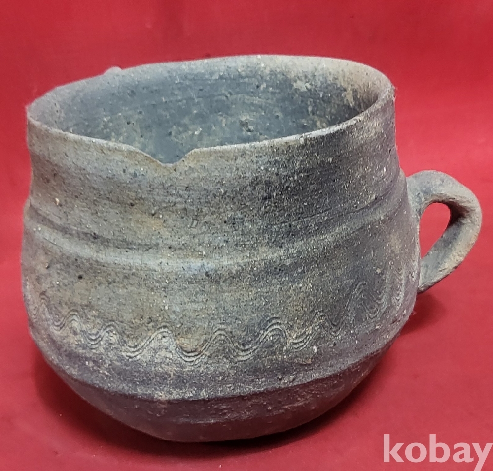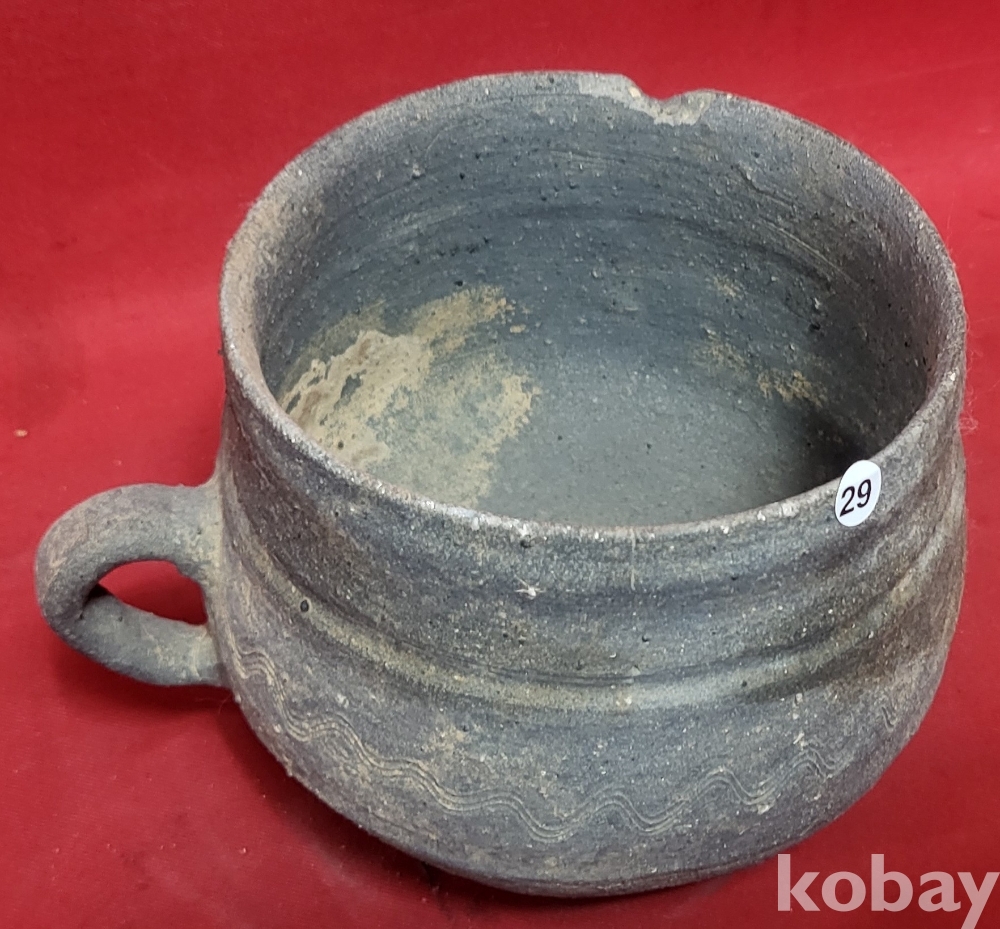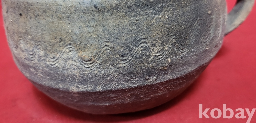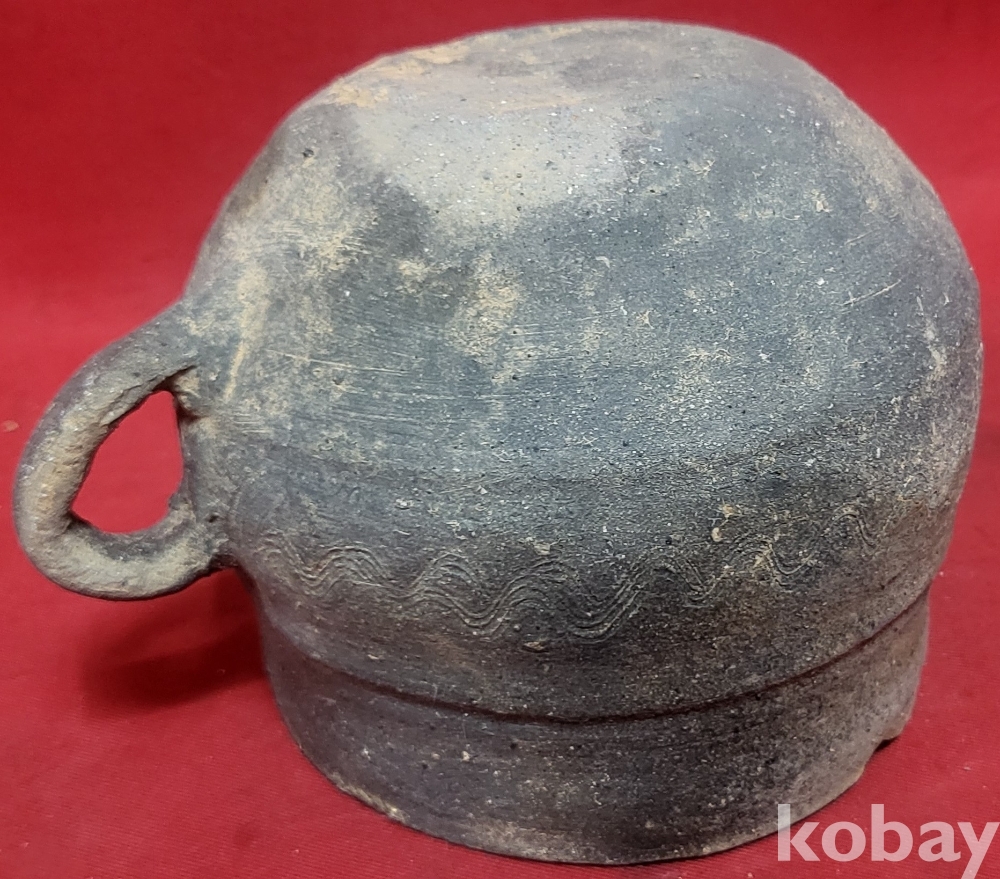 신라토기( 新羅土器) 물결 문양 손잡이가 달린 기물입니다다,허리선에 물결 문양이 시문된 명품입니다,