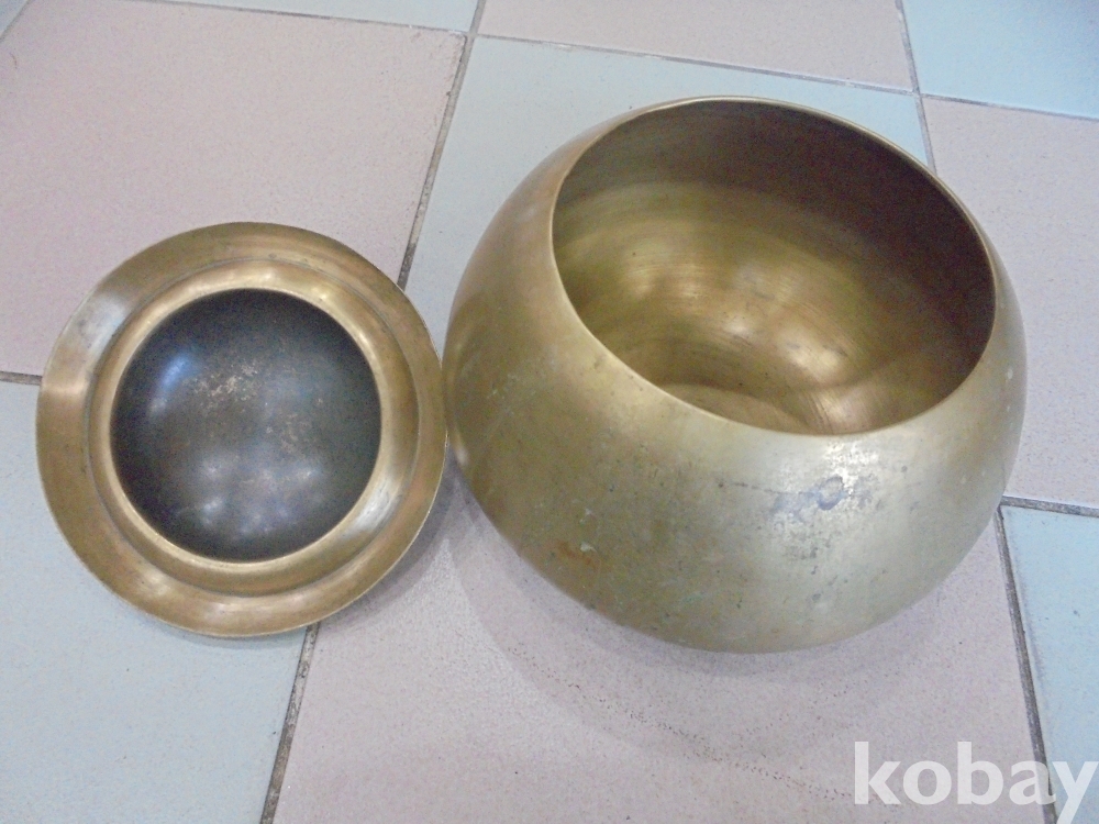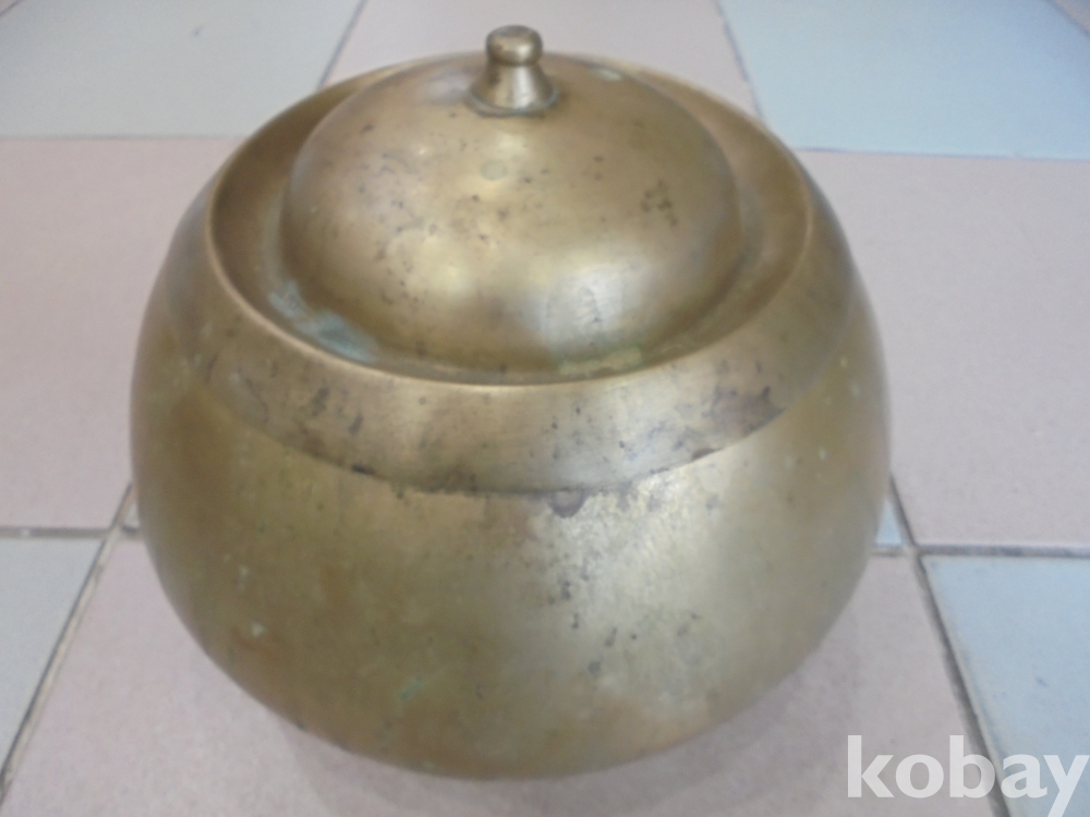 우리에 전통놋요강으로 잘살던집에서는 놋요강을 사용하던것으로 오래된 새는데없는 전통적인 제치뚜껑인 오리지날 놋쇠깨끗한 유기중간치요강