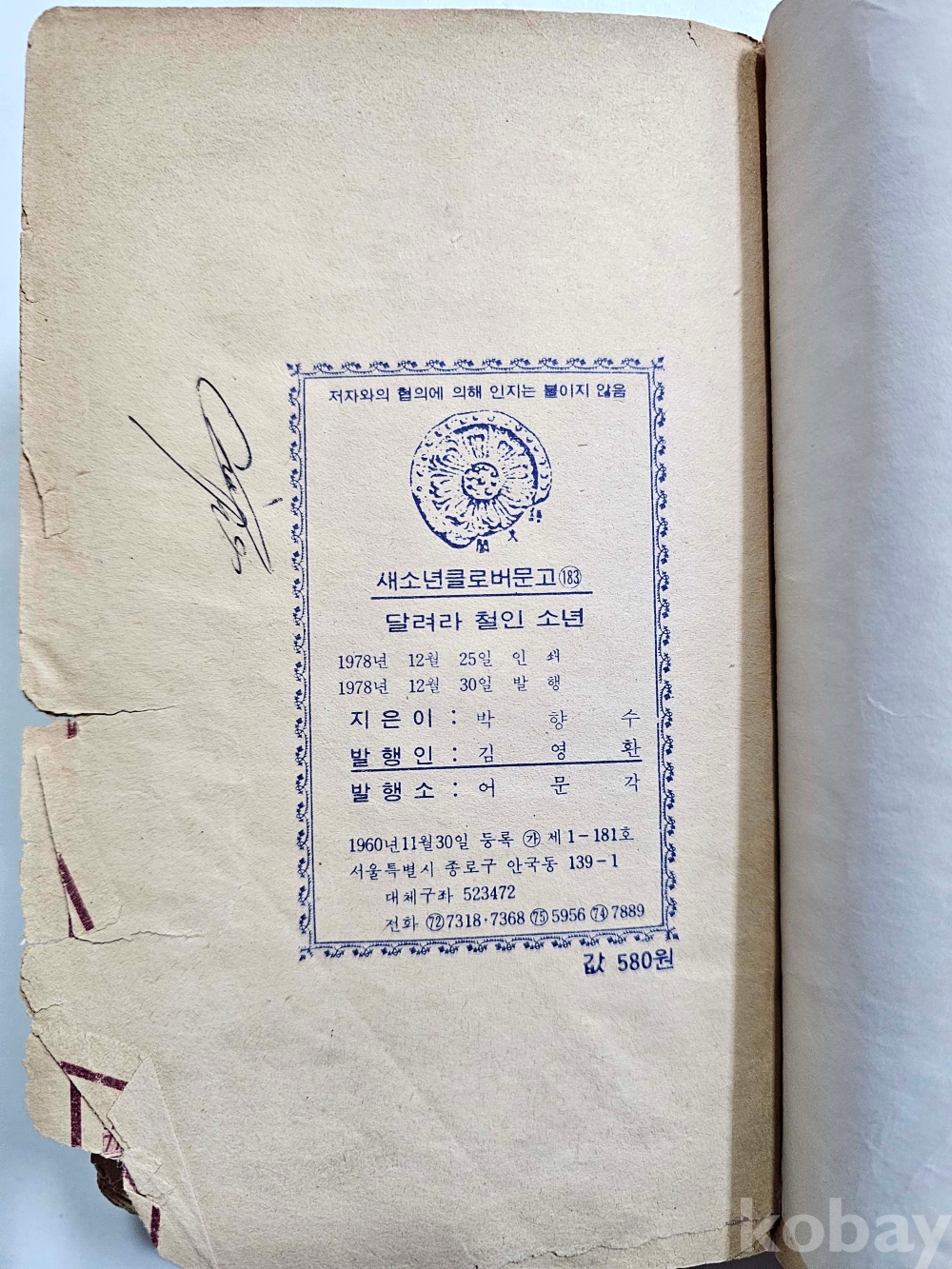 물 품 명 | 달려라 철인 소년 / 박향수 만화 / 1978년 / 어문각 |