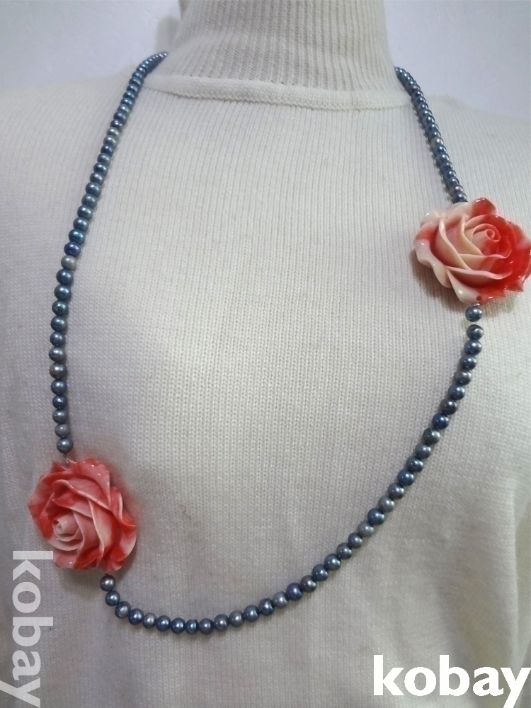 핵진주 목걸이에 마고(구운도자기) 장미가 달린 목걸이 입니다.