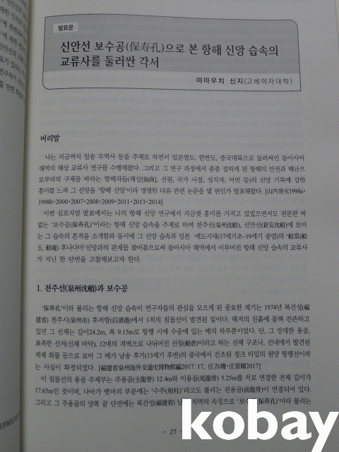 “신안船 ”(전남 新安군에서 발견된 沈沒船이라 하여 이렇게 불려짐) 에 대한 연구 성과.주로 선적된 도자기에 대한 연구와 전시는 많았으나,침몰된 선박 자체에 대한 연구는 그리 많지 않았다 포함일본과 중국의 연구 성과