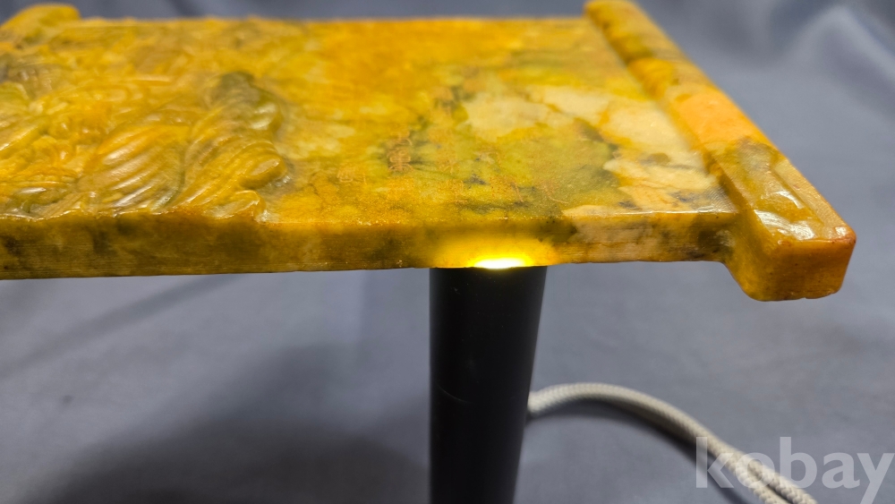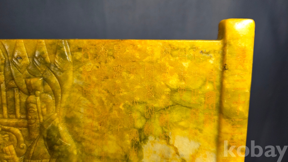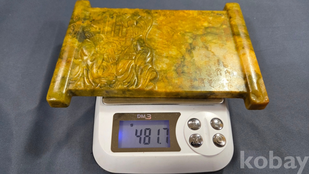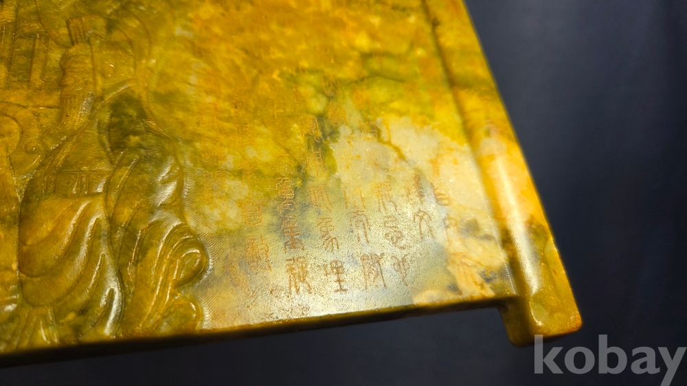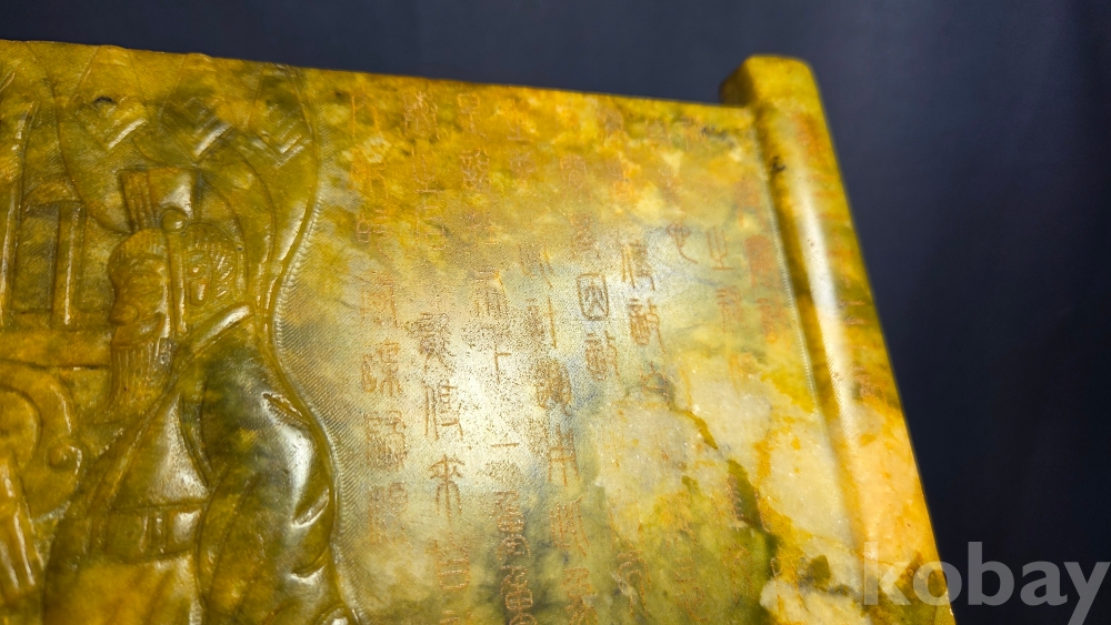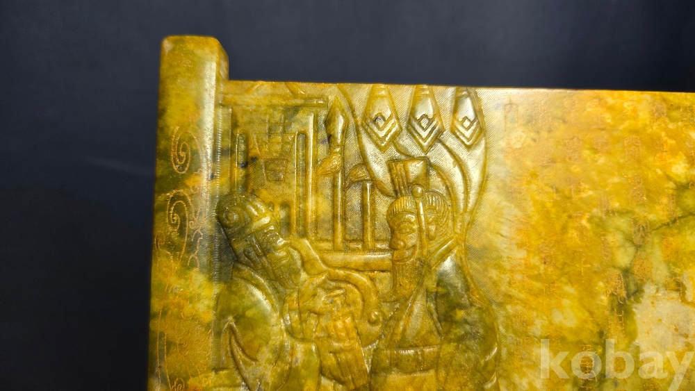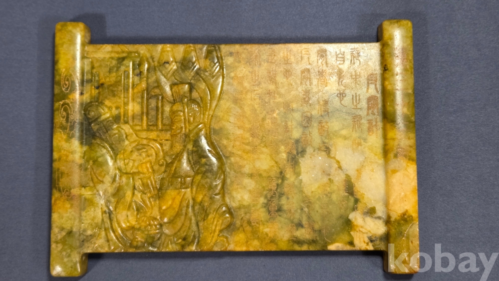 인물들의 모습이 조각되어 있는 옥판 옥조각품 입니다.