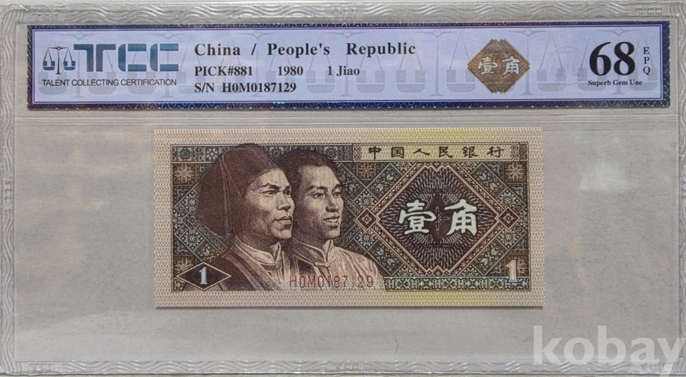 -1980년 중국 인민은행 발행 1각 지폐 TCC68 고등급 입니다.