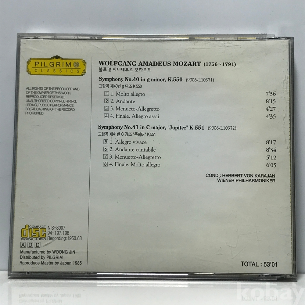 CD 25,000-41 모차르트 교향곡 40번 & 41번 주피터-헤르베르트 폰 카라얀 자켓 : 깨짐 디스크 : 사용품 깨끗 82 년 제작