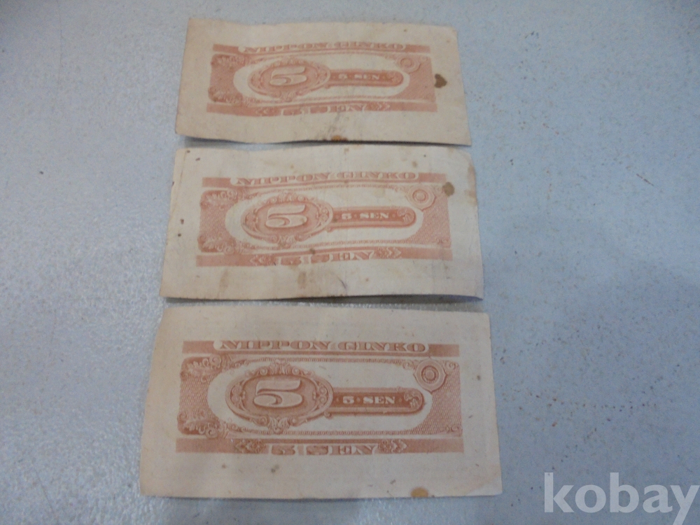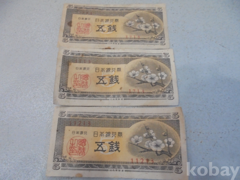 앞면에 매화꽃이 멋있게피고 일본은행 五錢과 도장이있고 뒷면 붉은색에 5자와 왜정시대 사용하던 아주귀한 수가적은 깨끗한 일본5전 3장