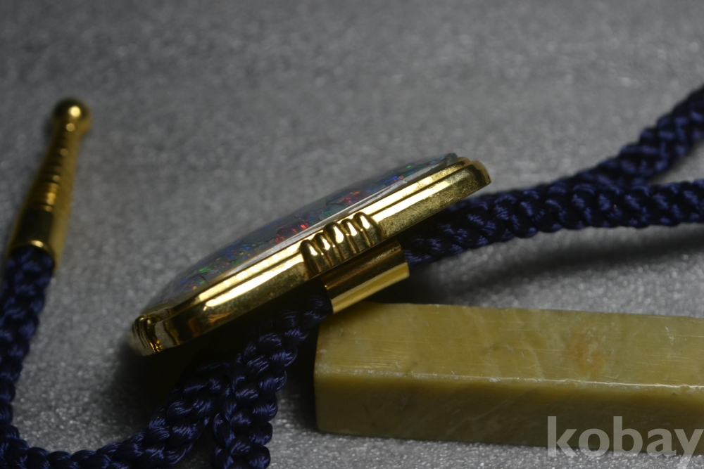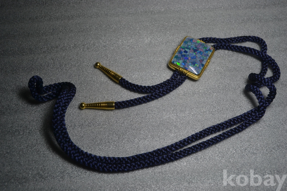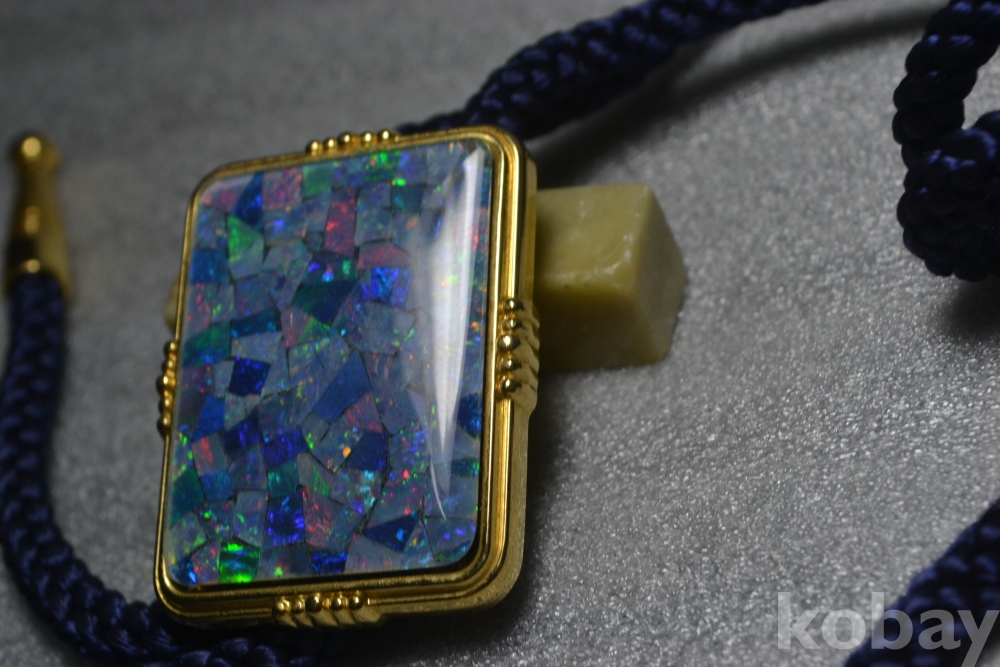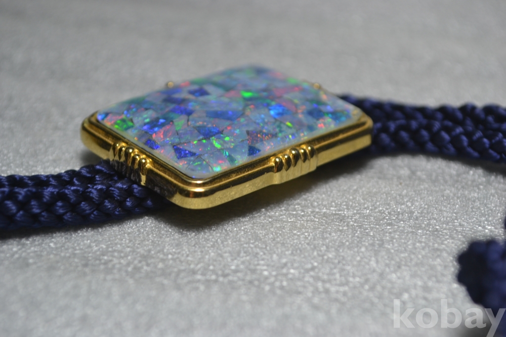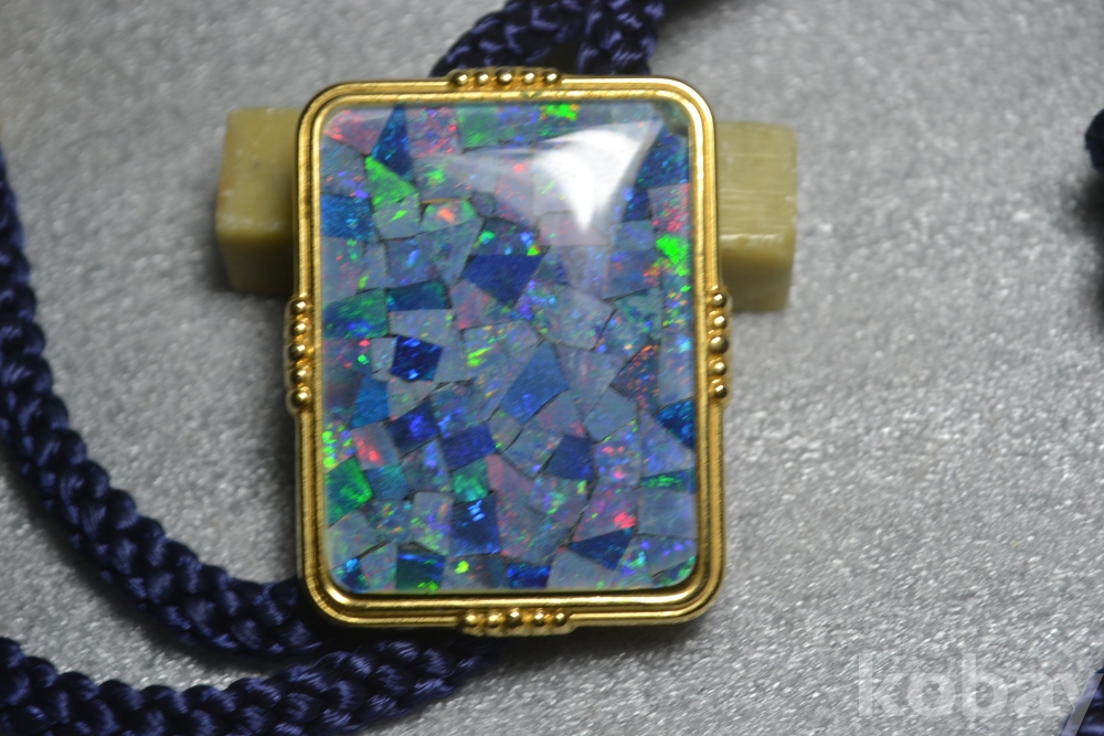 ㅡ> 사진으로 보시는대로 묵직하고 튼튼한 고급 금장도금 메탈베이스판위에 섬세하고 아름다운 화려한 색채의 조각형 오팔보석들이 모자이크식으로 정교하게 짜맞추어진 디자인의 아름다운 고급 모자이크 오팔보석 루프타이 작품 입니다. (사진참조)
