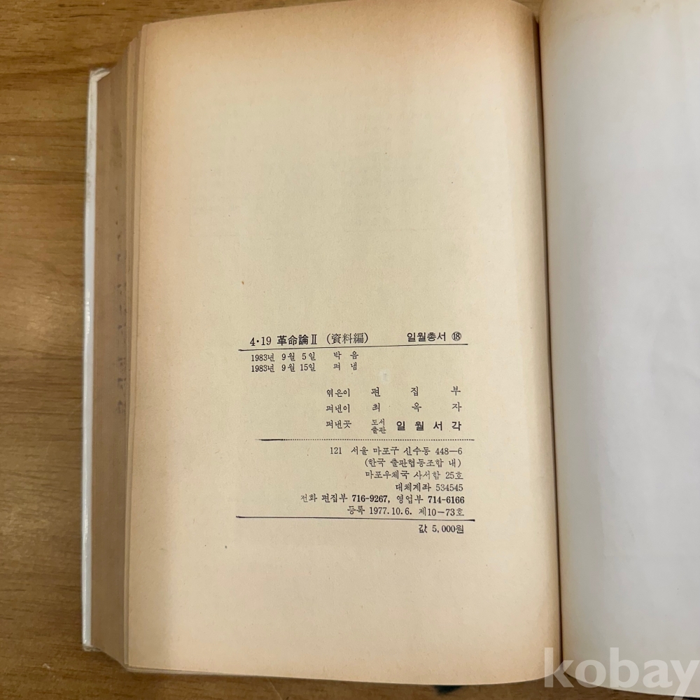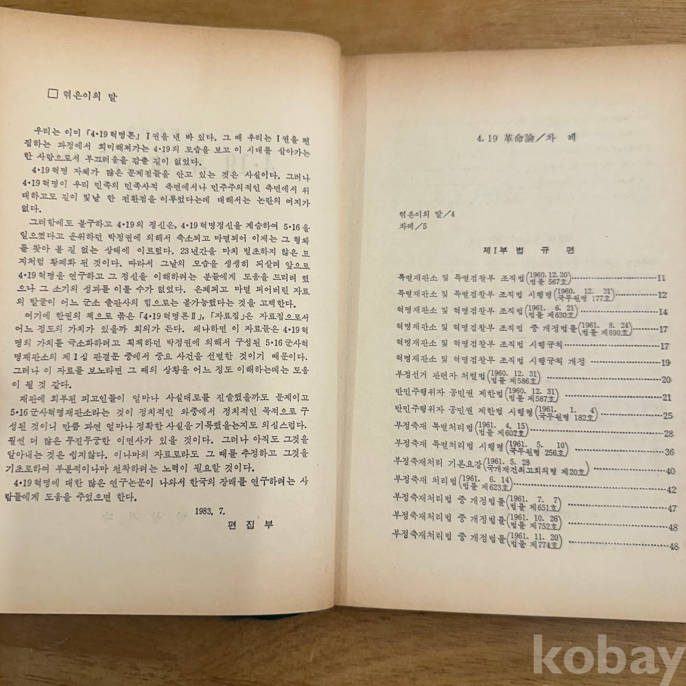[한국현대사, 학생혁명] 일월서각 편집부, <4.19 혁명론 2 (자료편 )1983년 초판본>, 일월서각, 1983, p. 465, 상태 하급(사진참조)