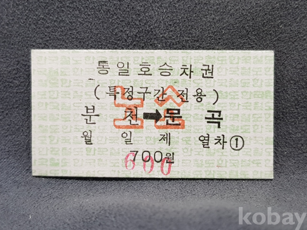 - 미사용 통일호 승차권(특정구간전용) 노소 " 분천 ▶ 문곡 " 600원