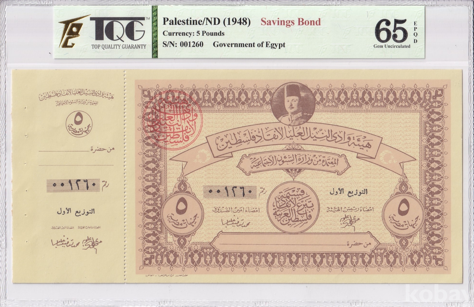 - 이 채권은 1948년 제1차 중동 전쟁(아랍-이스라엘 전쟁) 당시 팔레스타인을 지원하기 위해 이집트 정부에서 발행한 것입니다.