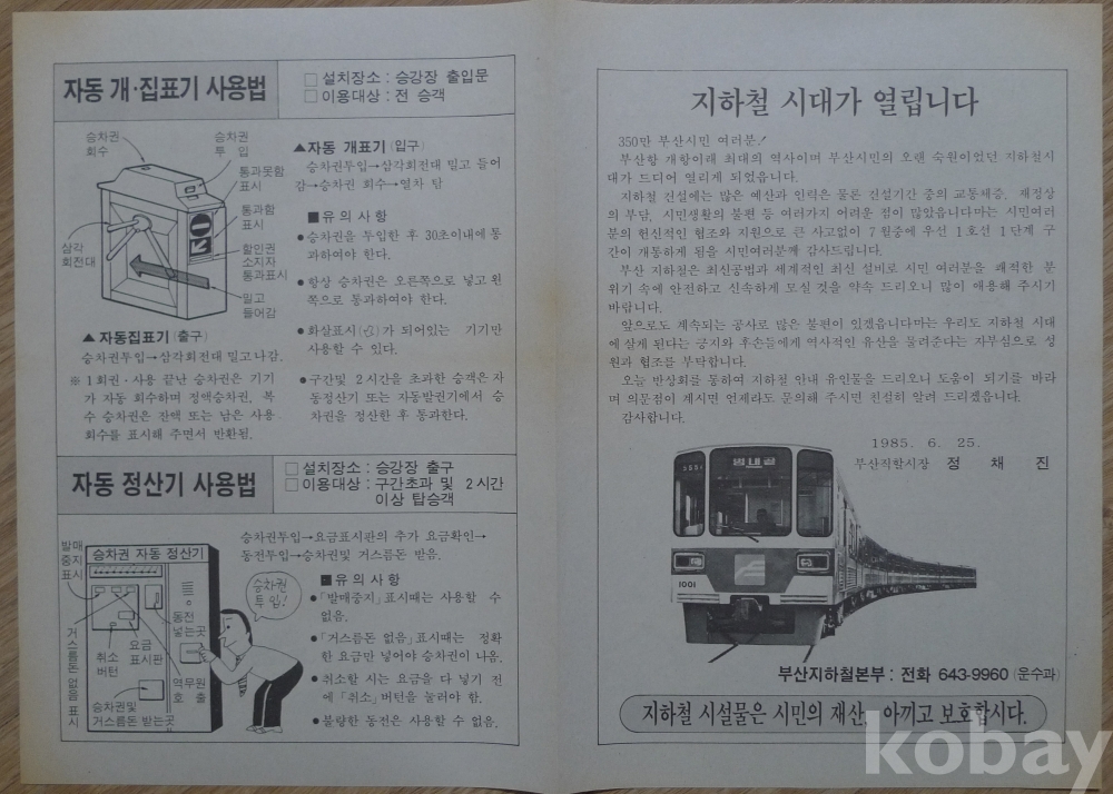 1985년 부산시 지하철 시대가 열립니다 광고 전단지