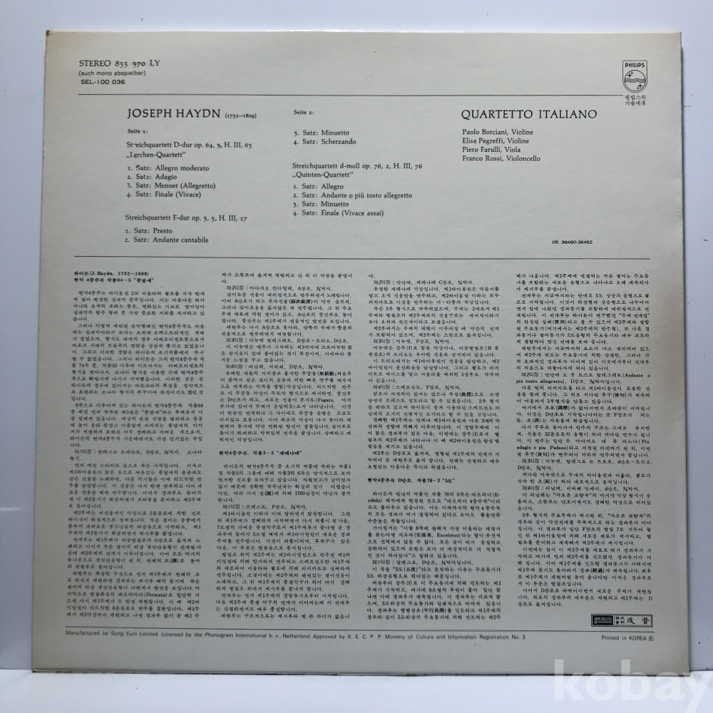 LP 10,400-26 Haydn - Streichquartett (Quartetto Italiano) _ 자켓 EX+ 알판 EX+ 72 년 국내반