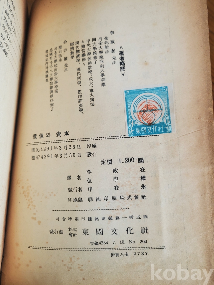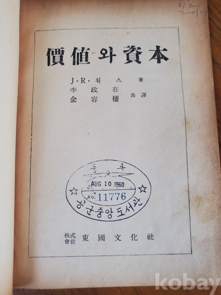 1. 가치와 자본, J ․ R 휙스(이정재 김용권 번역), 동국문화사, 1958년, 208쪽, 상태 상, 사진 참조