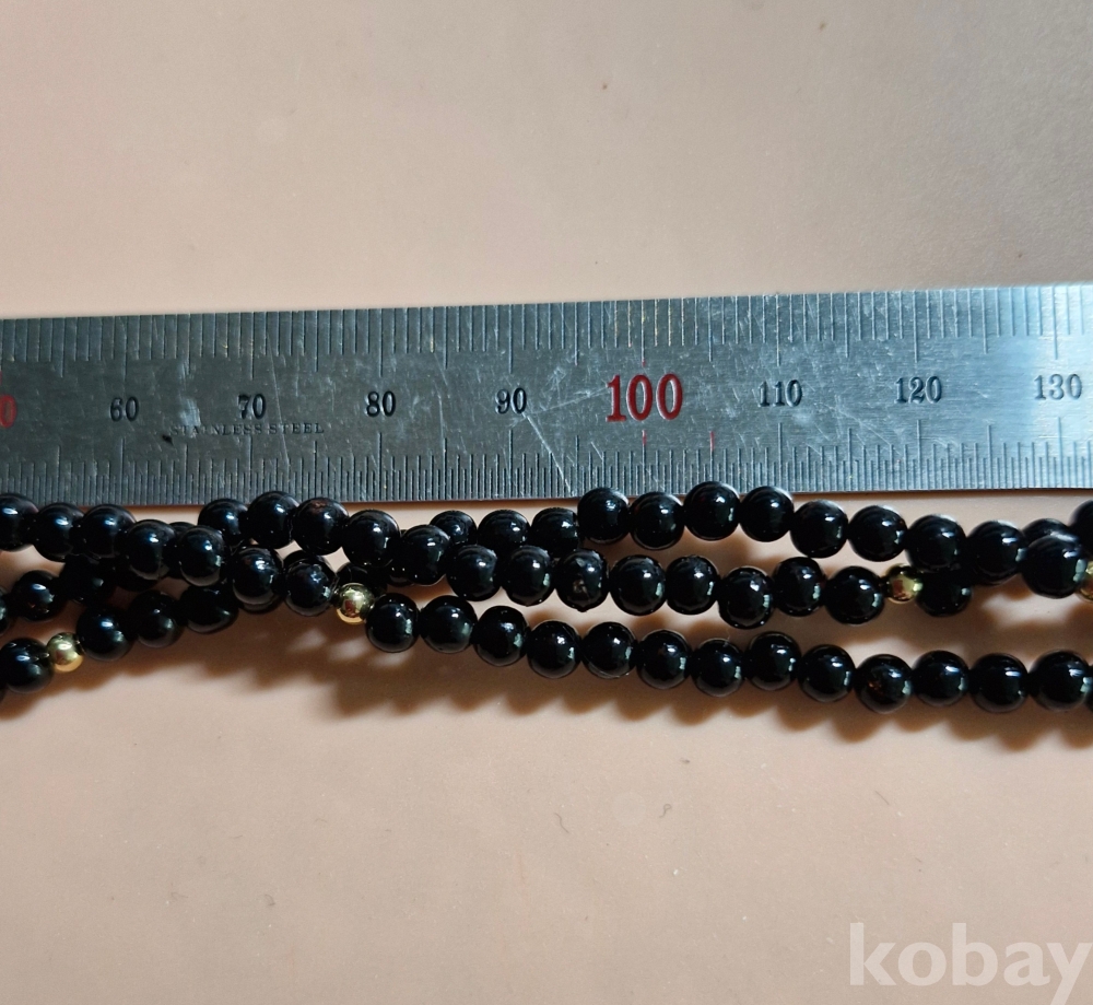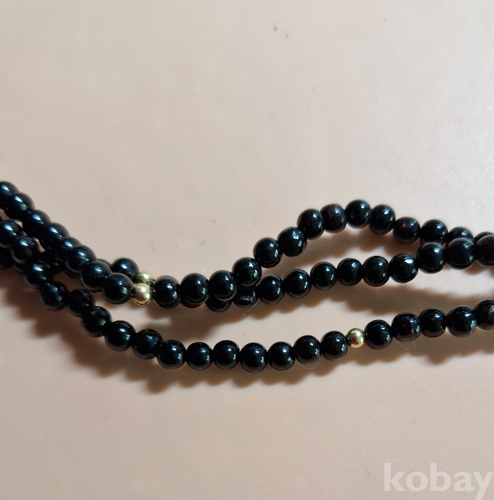 산호 한 알은 약 4mm 정도이며, 신추로 만든 황금색 잠금장식과 중간의 구슬들이 검은 색과 잘 대비됩니다.