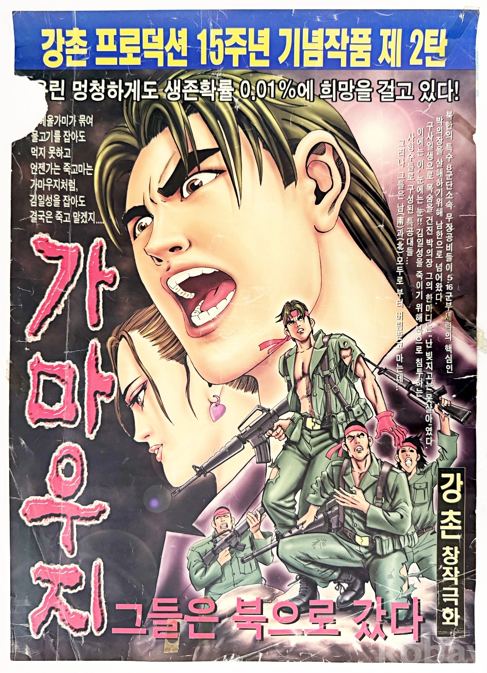 상품 설명 | 강촌 창작극화 '가마우지 : 그들은 북으로 갔다' 만화책 홍보 포스터이다. 왼쪽 옆면 유실됨, 오른쪽 테이프 수리 있음. | ||