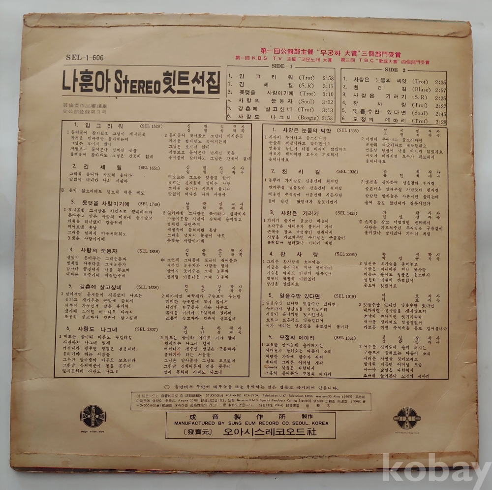 나훈아Lp/임 그리워,사랑은 눈물의 씨앗