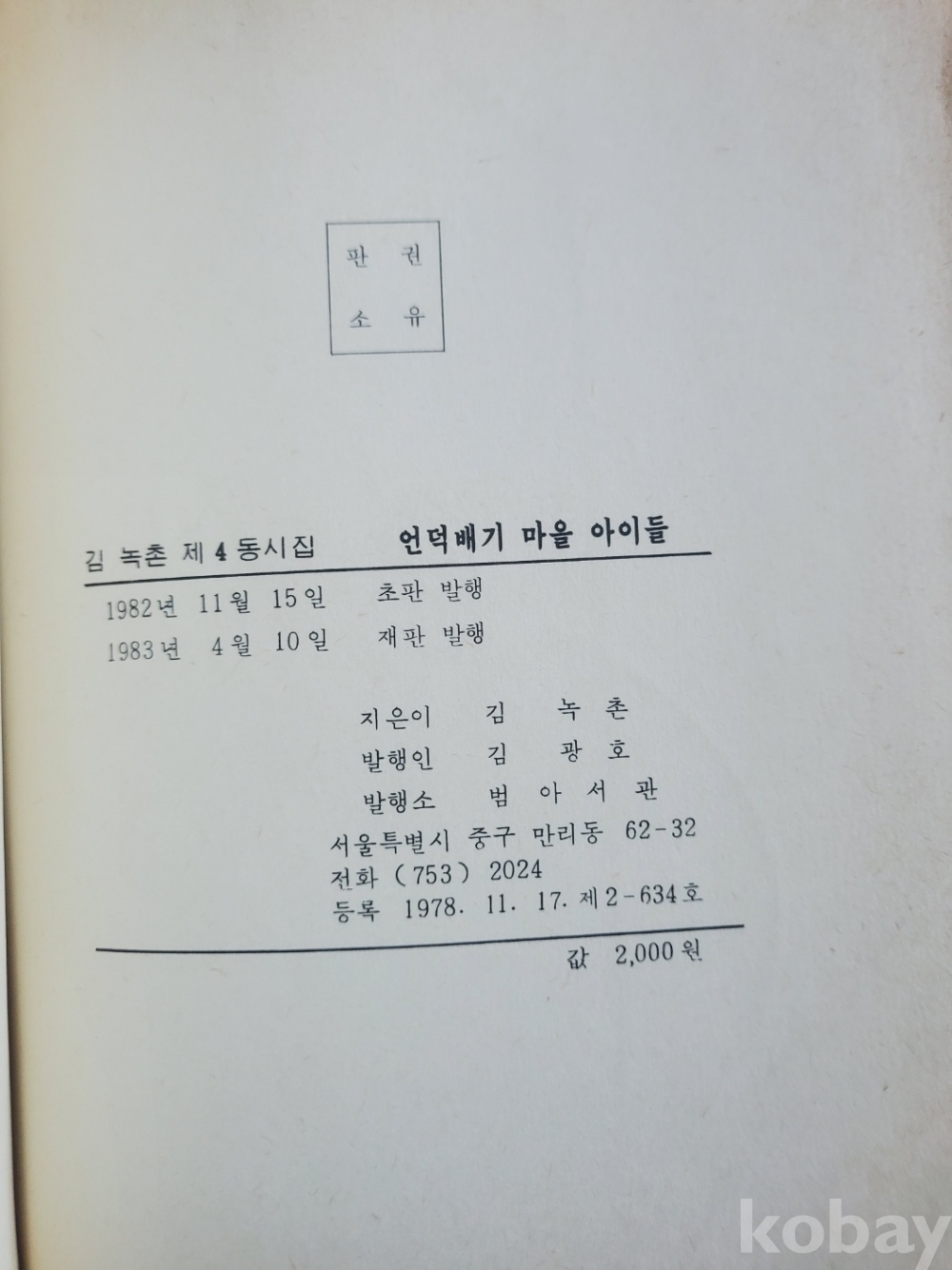 1. 언덕배기 마을 아이들, 김녹촌, 범아서관, 1982년, 163쪽, 상태 상, 사진 참조