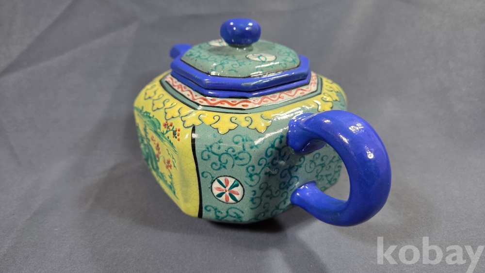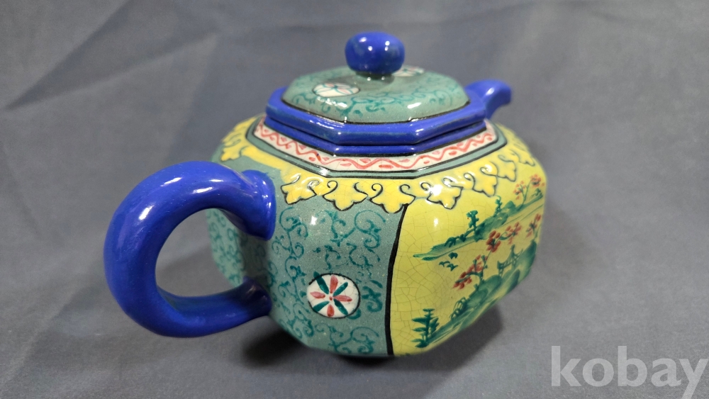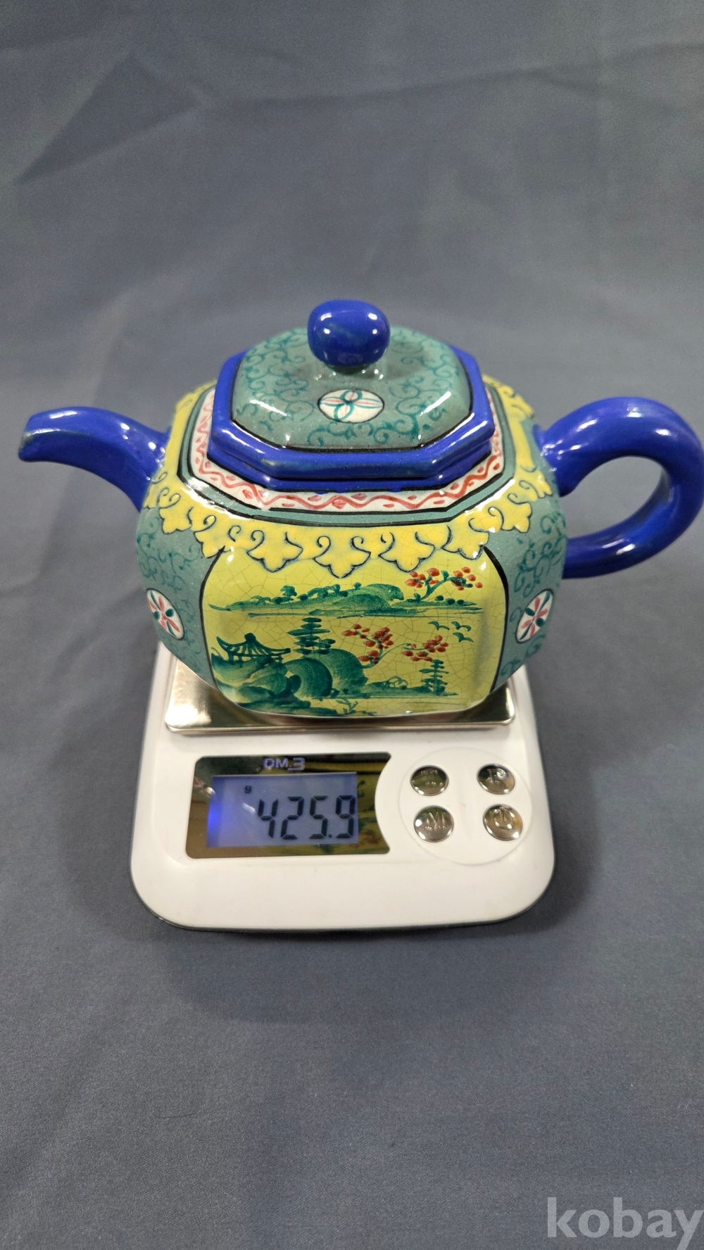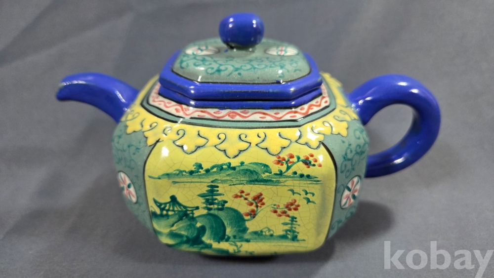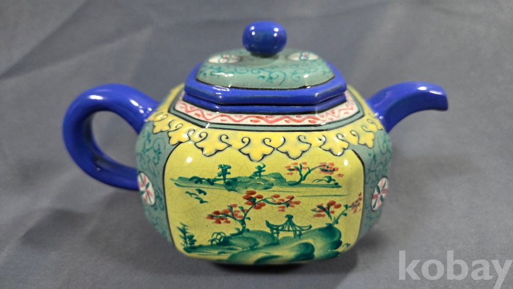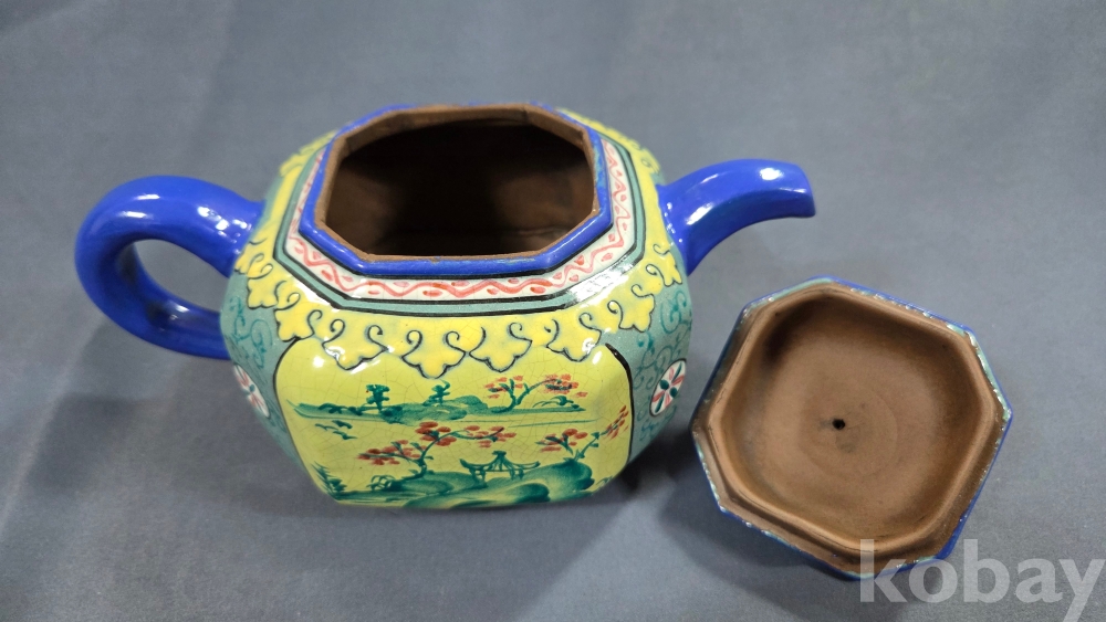 노란색 바탕에 풍경화 문양이 그려져있는 화려한 자사주전자 입니다.