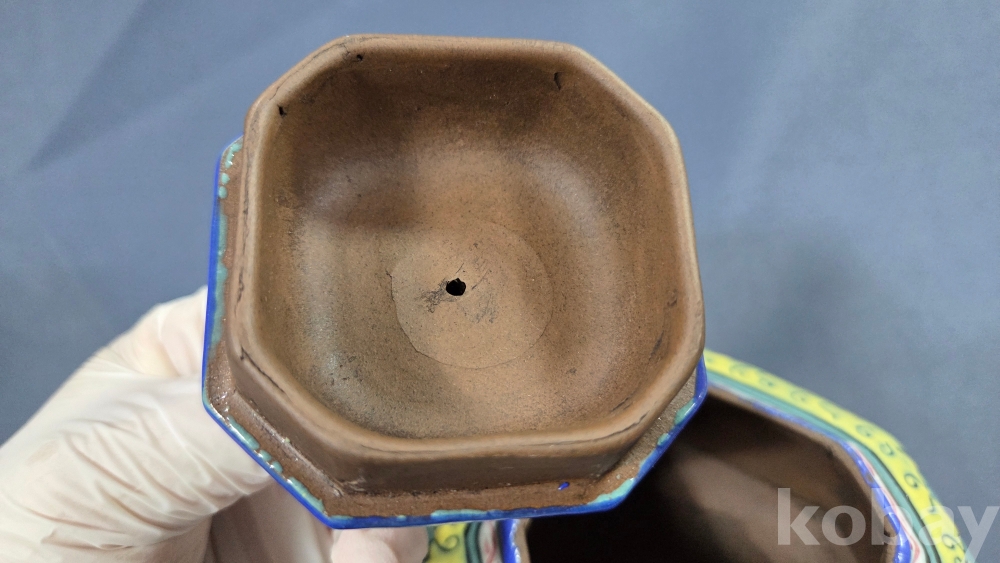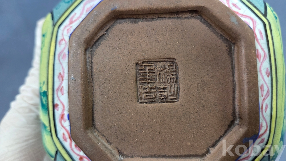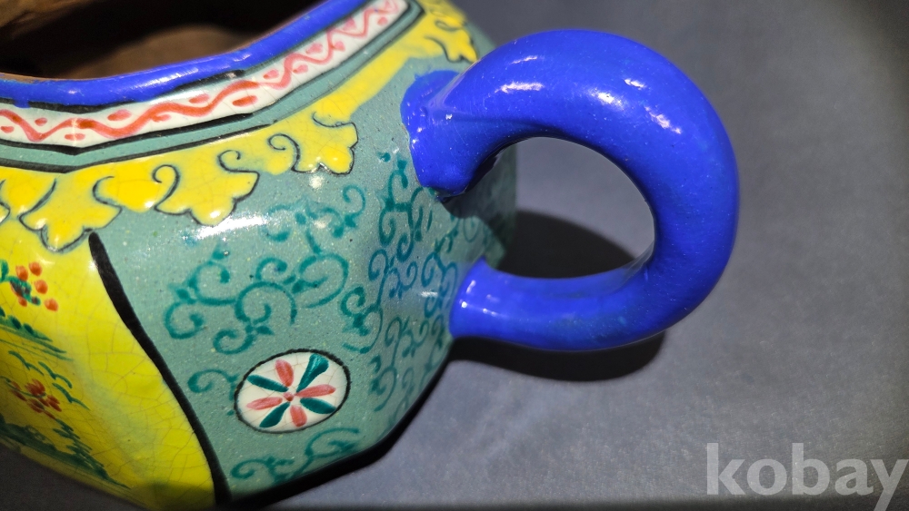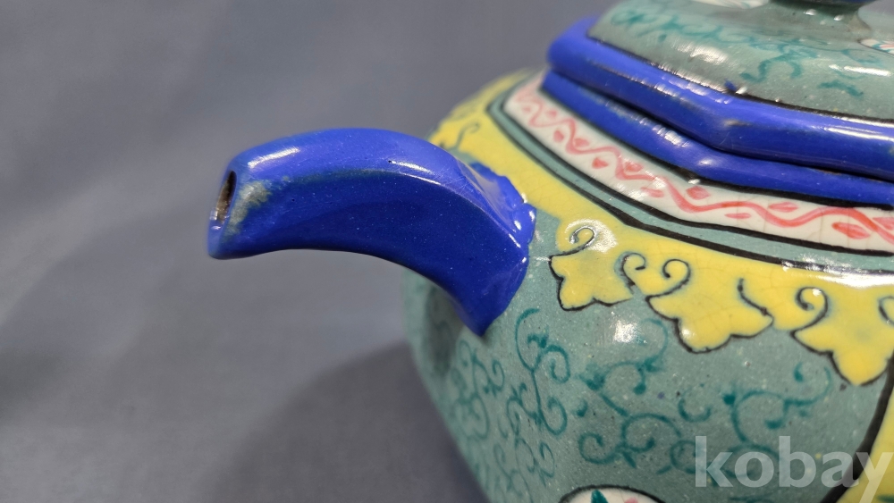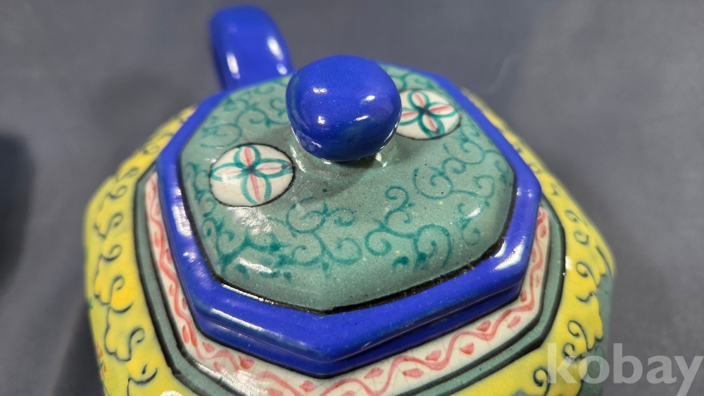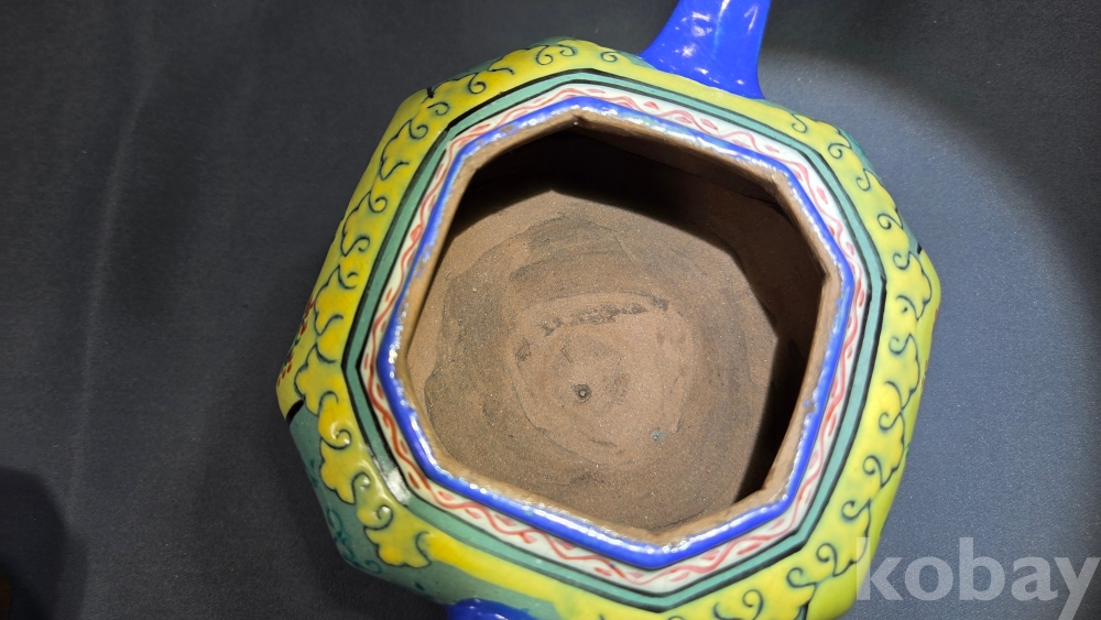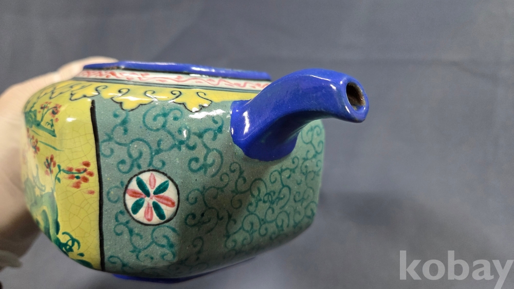 노란색 바탕에 풍경화 문양이 그려져있는 화려한 자사주전자 입니다.