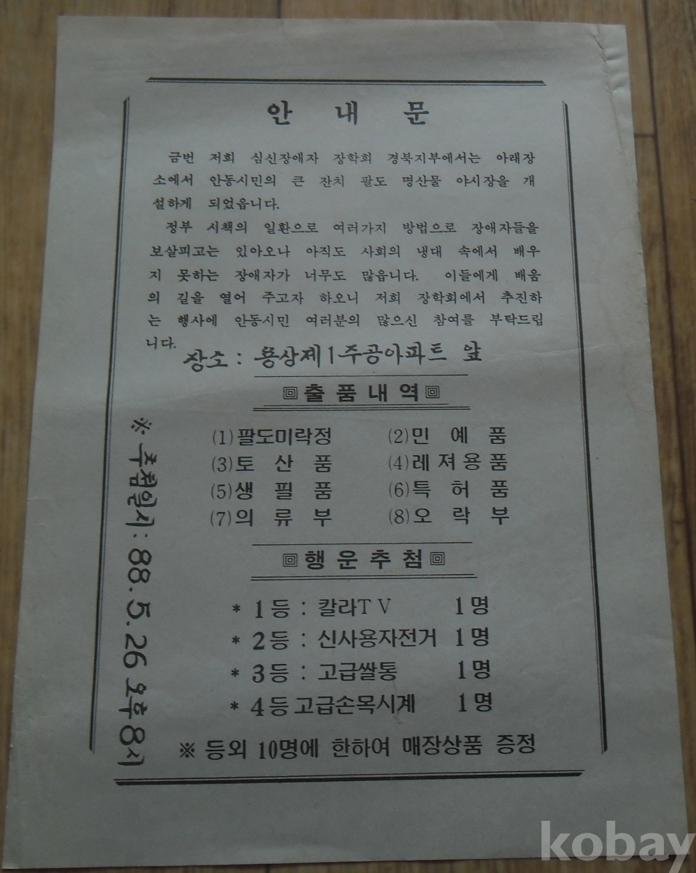 안동관련 전단지: 심신장애자장학회 경북지부 명산물 판매