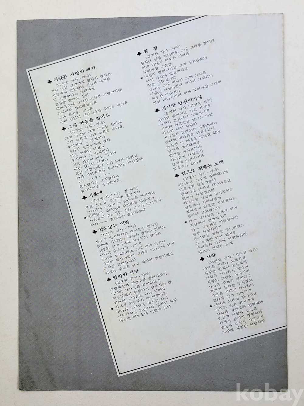 | 자켓상태 | EX : 약간의 마모, 모서리 찢김 존재 | 음반상태 | NM : 개봉했으나 미사용급, 스크래치 없음 | 발매정보 | 초반 | 가사지여부 | 유 |