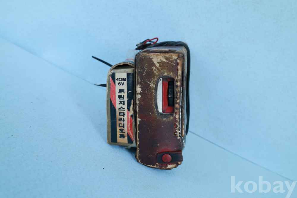 특히 본 기기의 가장 큰 관전 포인트이자 희소성을 더해주는 것은 고무줄로 단단히 묶여 원형 그대로 보존된 '4DM 6V 트란지스타라디오용' 고전 국산 배터리입니다.