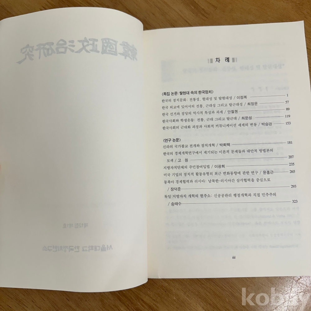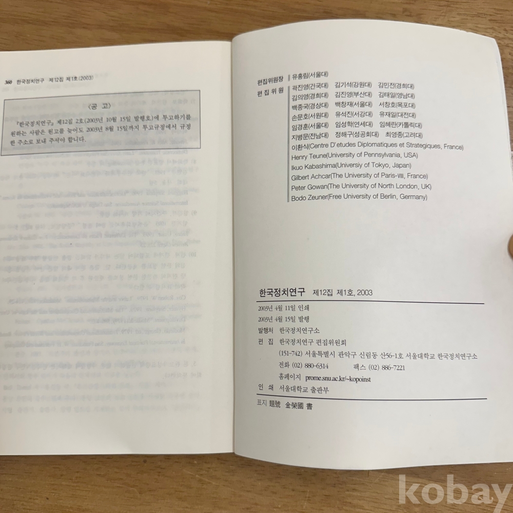 [한국현대사, 정치] 서울대학교 한국정치연구소, <한국정치연구 제12집 제1호 2003>, 2003, p. 360, 상태 중급(사진참조)
