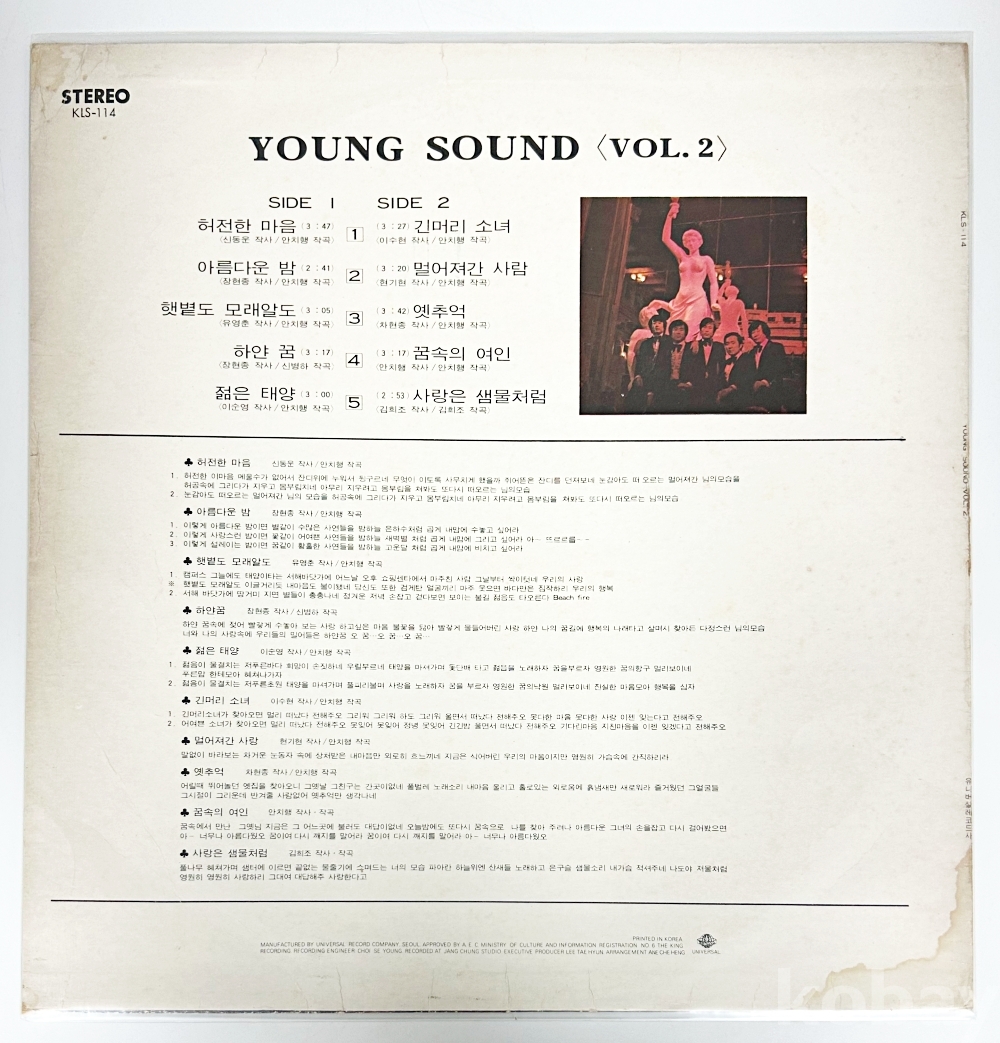 상품 설명 | Side A 1. 허전한 마음 2. 아름다운 밤 3. 햇볕도 모래알도 4. 하얀 꿈 5. 젊은 태양 Side B 1. 긴머리 소녀 2. 멀어져간 사람 3. 옛추억 4. 꿈속의 여인 5. 사랑은 샘물처럼 | ||